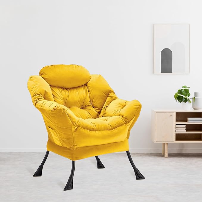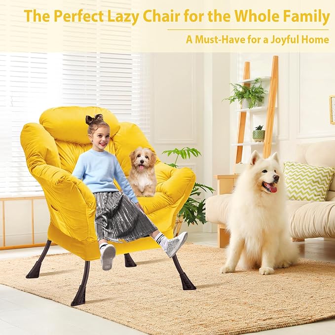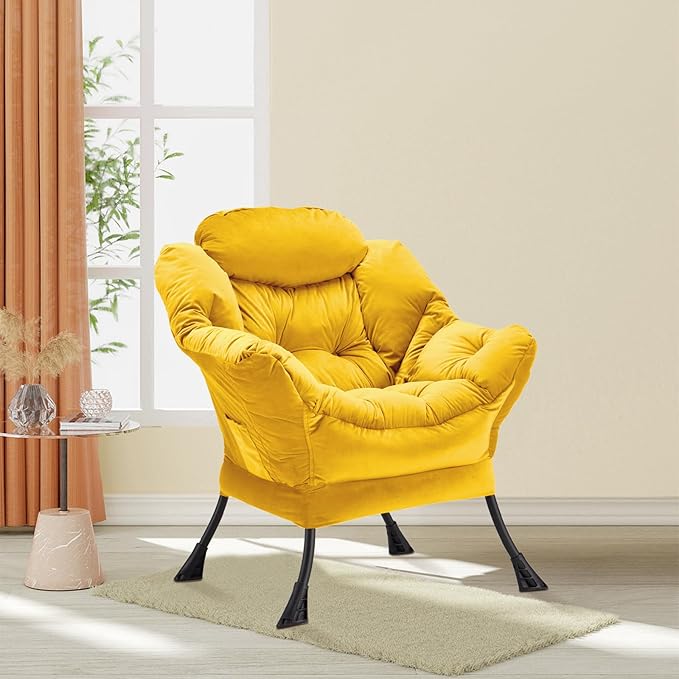Lazy Chair Thick Padded, Accent Chair Velvet Upholstered with Wide Seat, Stable Metal Frame and Non-Slip Pad, Modern Sofa Armchair with Side Storage Bag for Dorm, Room, Office, Yellow
