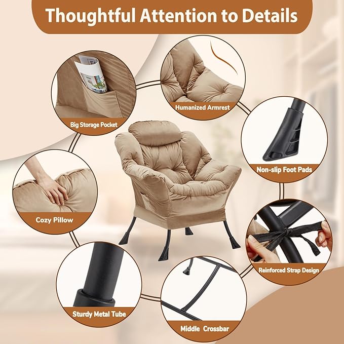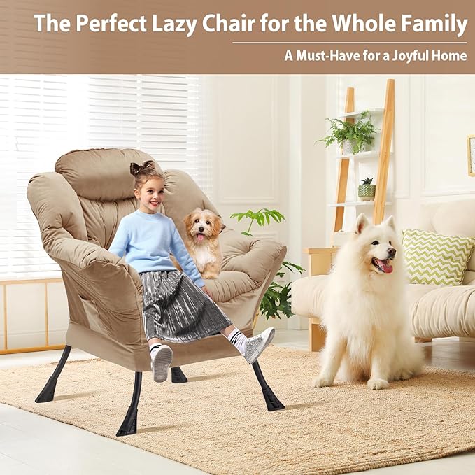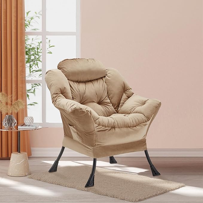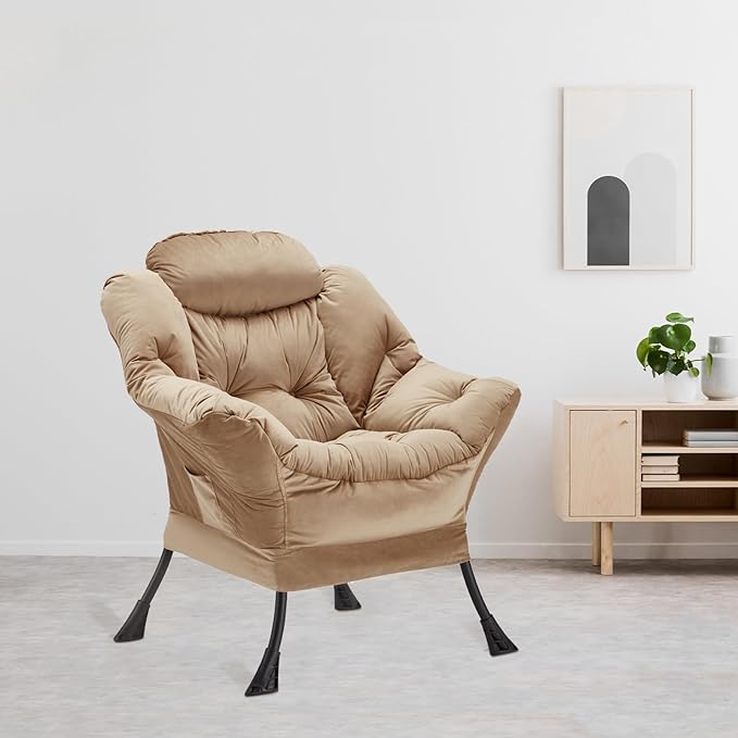 Lazy Chair Thick Padded, Accent Chair Velvet Upholstered with Wide Seat, Stable Metal Frame and Non-Slip Pad, Modern Sofa Armchair with Side Storage Bag for Dorm, Room, Office, Khaki