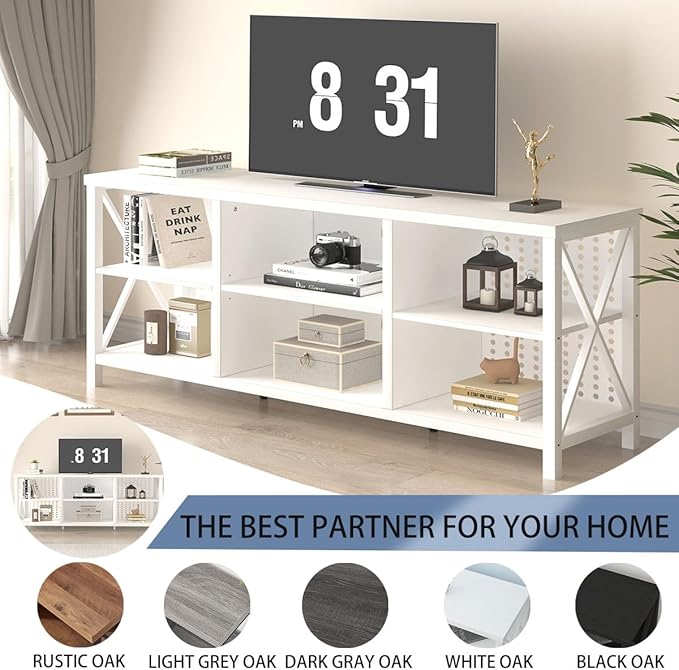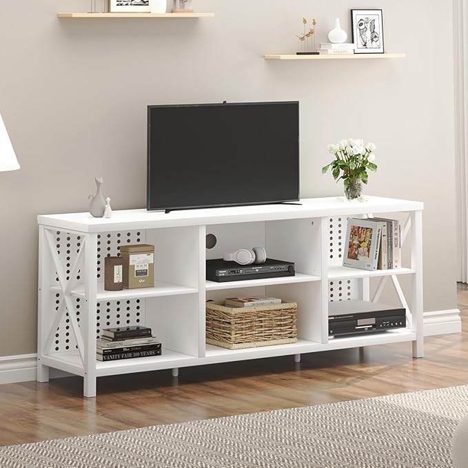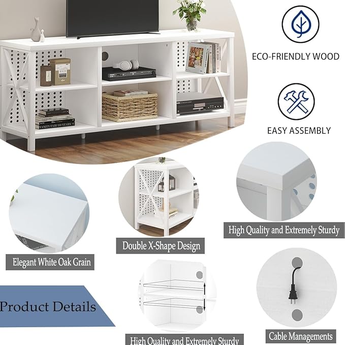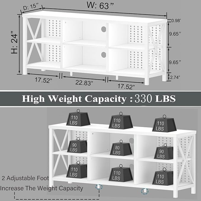 LVB White TV Stand for 75 Inch TV, Large Industrial Wood Entertainment Center with Storage Cabinet, Long Modern Metal Television Stands Console Table for Home Living Room Bedroom, White Oak, 63 Inch
