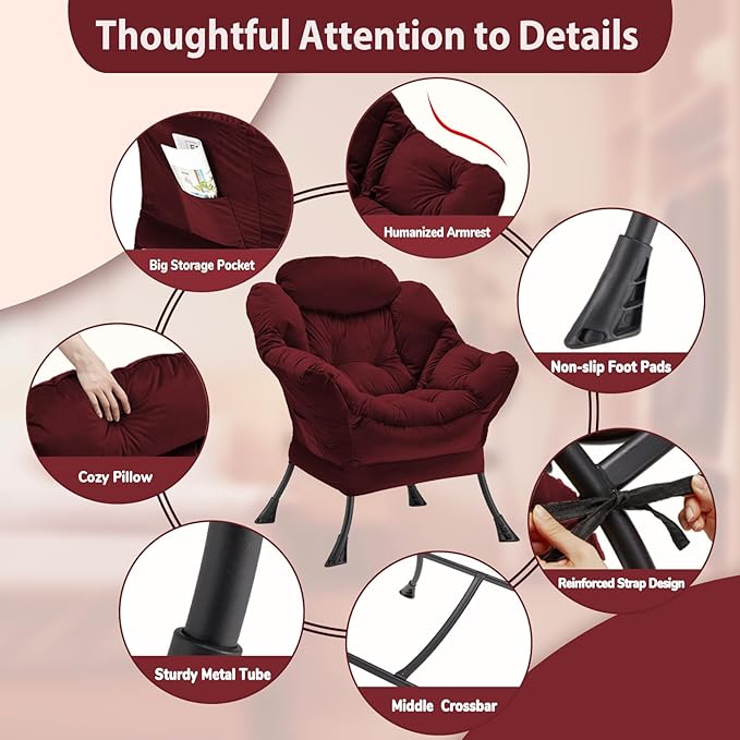 Lazy Chair Thick Padded, Accent Chair Velvet Upholstered with Wide Seat, Stable Metal Frame and Non-Slip Pad, Modern Sofa Armchair with Side Storage Bag for Dorm, Room, Office, Burgundy