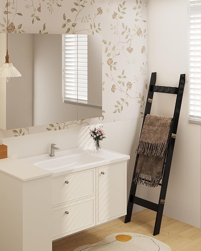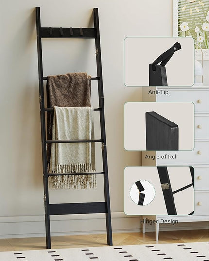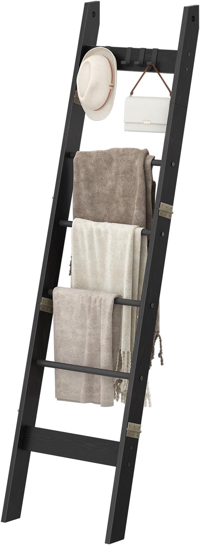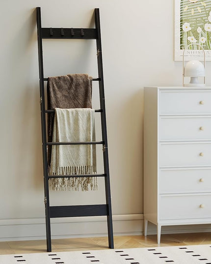Blanket Ladder Shelf for Living Room, Decorative Wood Quilt Rack with 4 Removable Hooks, 6-Tier Farmhouse Ladder Holder Organizer for Bedroom, Black BR31504B