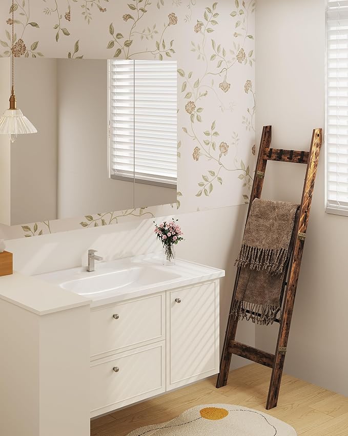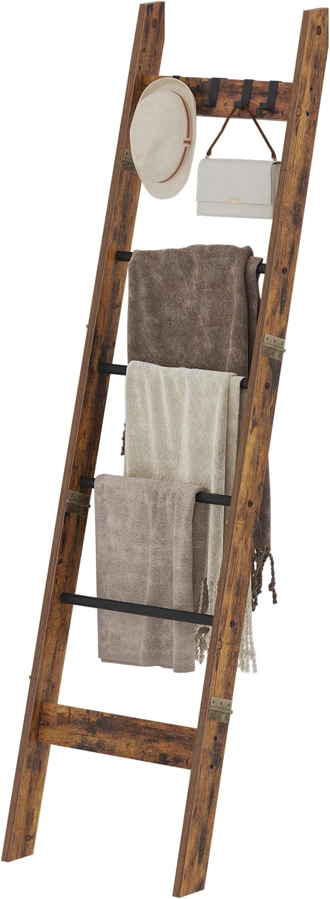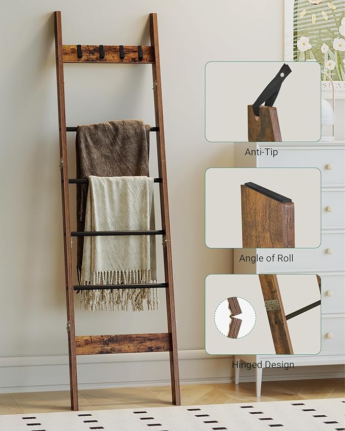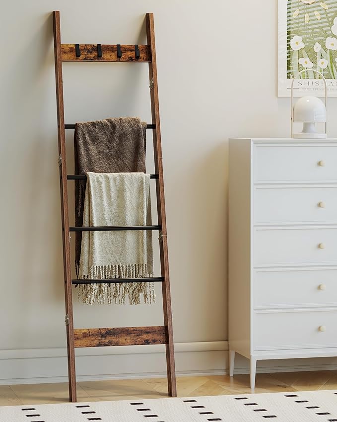 Blanket Ladder Shelf for Living Room, Decorative Wood Quilt Rack with 4 Removable Hooks, 6-Tier Farmhouse Ladder Holder Organizer for Bedroom, Rustic Brown and Black BR31501B