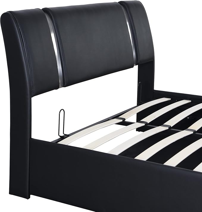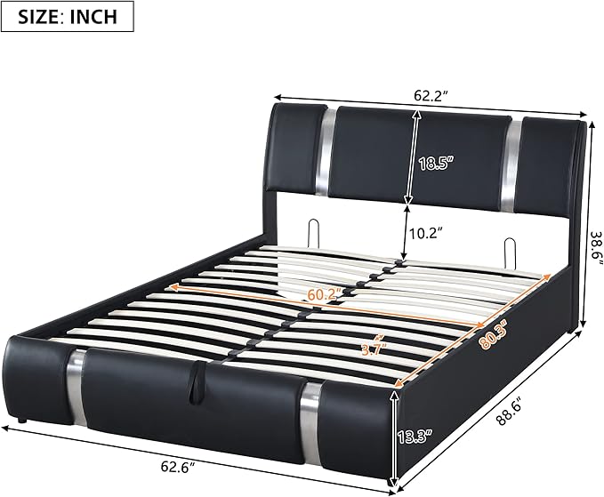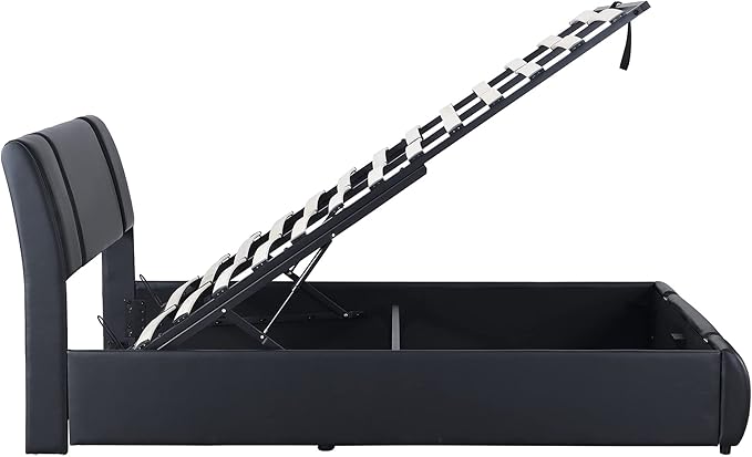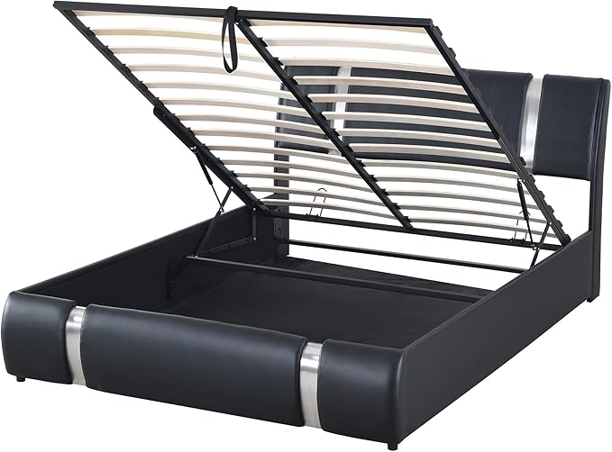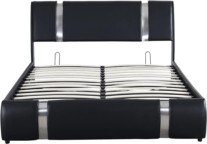Modern Queen Size Upholstered Faux Leather Platform Bed with a Hydraulic Storage System, Metal Strips Headboard and Footboard, No Box Spring Needed, Sturdy Slat Support, Easy to Assemble