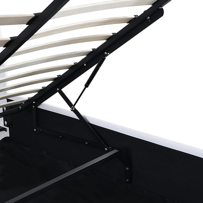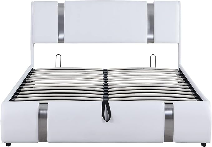 Modern Queen Size Upholstered Faux Leather Platform Bed with a Hydraulic Storage System, Metal Strips Headboard and Footboard, No Box Spring Needed, Sturdy Slat Support, Easy to Assemble