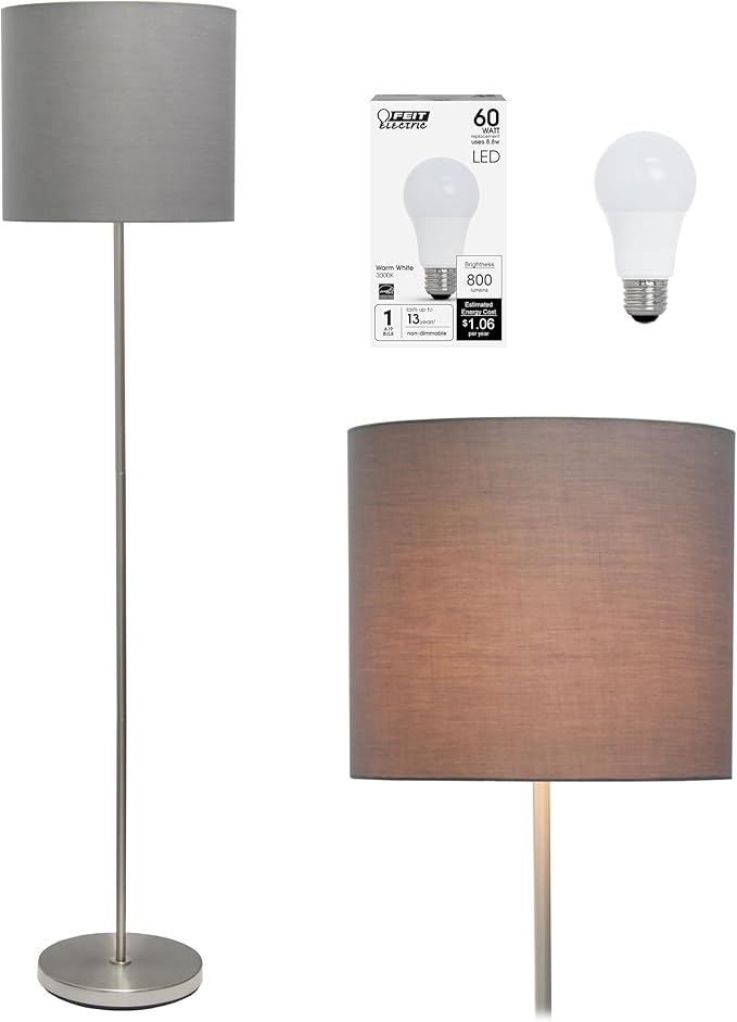 Simple Designs LF2004-GRY-LB 57" Traditional Brushed Nickel Stick Floor Lamp with Gray Shade for Living Room, Hallway, Entryway, Bedroom, Office, with Feit LED Bulb Included