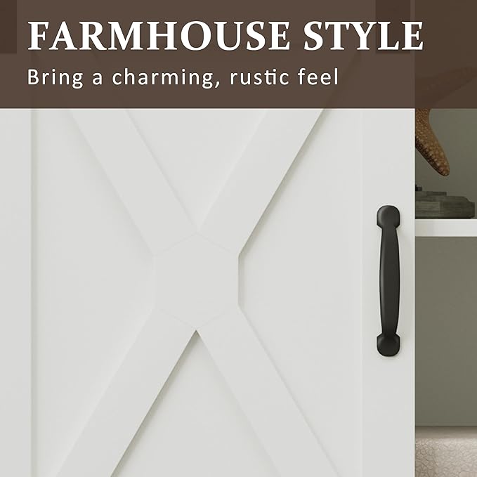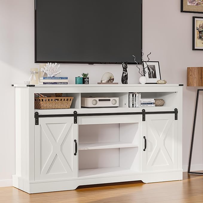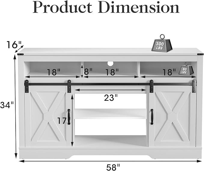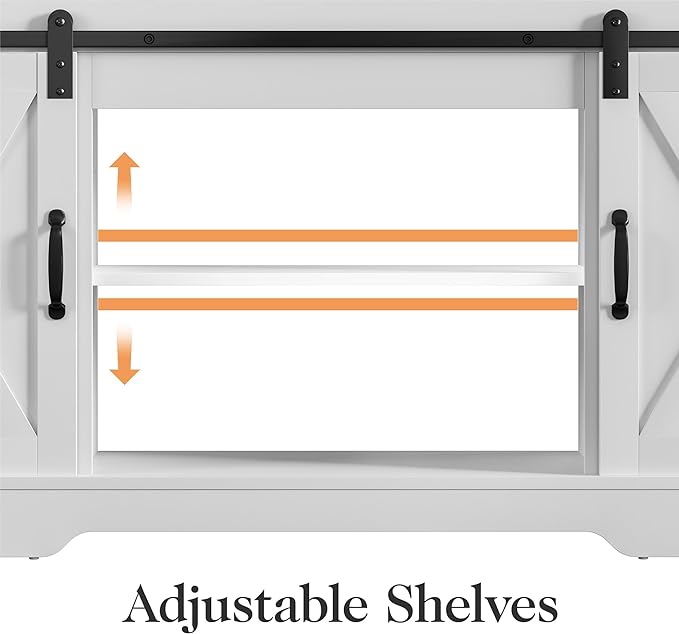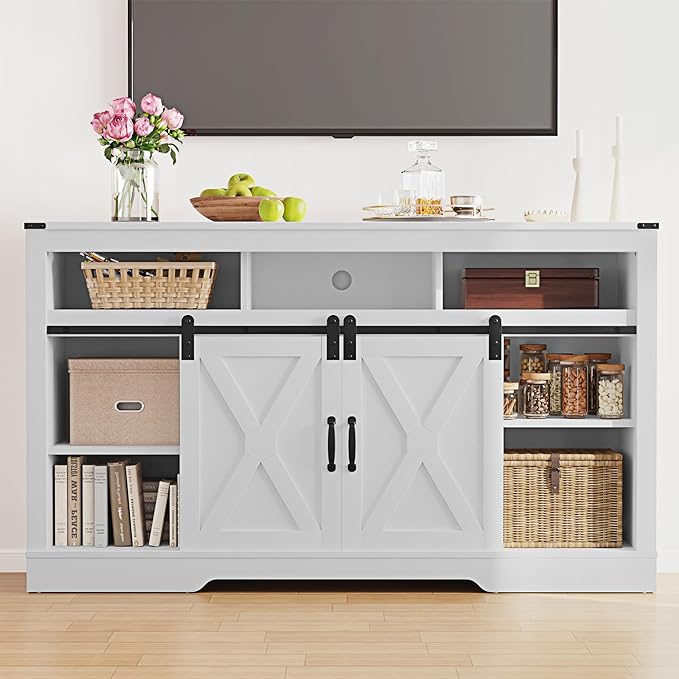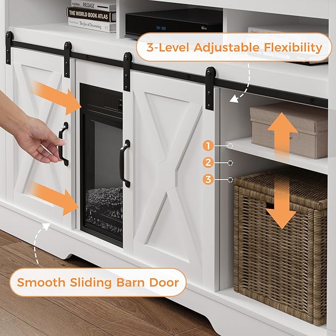 Farmhouse TV Stand for 23" Fireplace, 34'' Tall Entertainment Center for 65+ Inch TV, Rustic TV Console with Sliding Bar Door for Living Room (White)