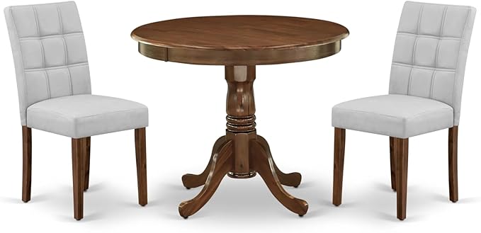 East West Furniture ANAS3-AWA-27 3 Piece Modern Dining Set consists A Dinning Table and 2 Light Gray Faux Leather Dinner Chairs, Antique Walnut, 36x36 Inch