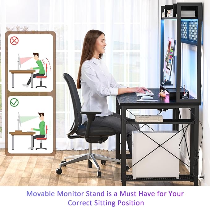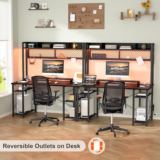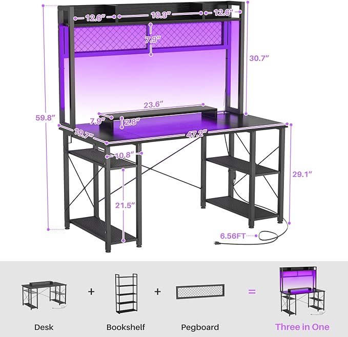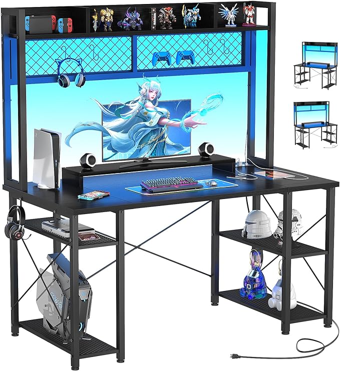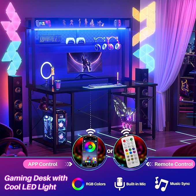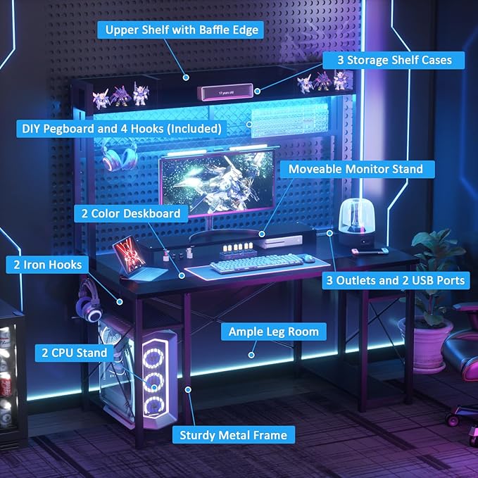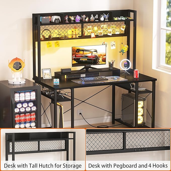 armocity 2024 Upgrade Gaming Desk with Hutch, 48'' Magic Computer Desk with LED Lights and Outlets, Reversible Workstation Desk with Pegboard and Monitor Stand, 48 Gamer Desk PC Table, Black