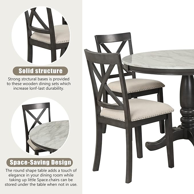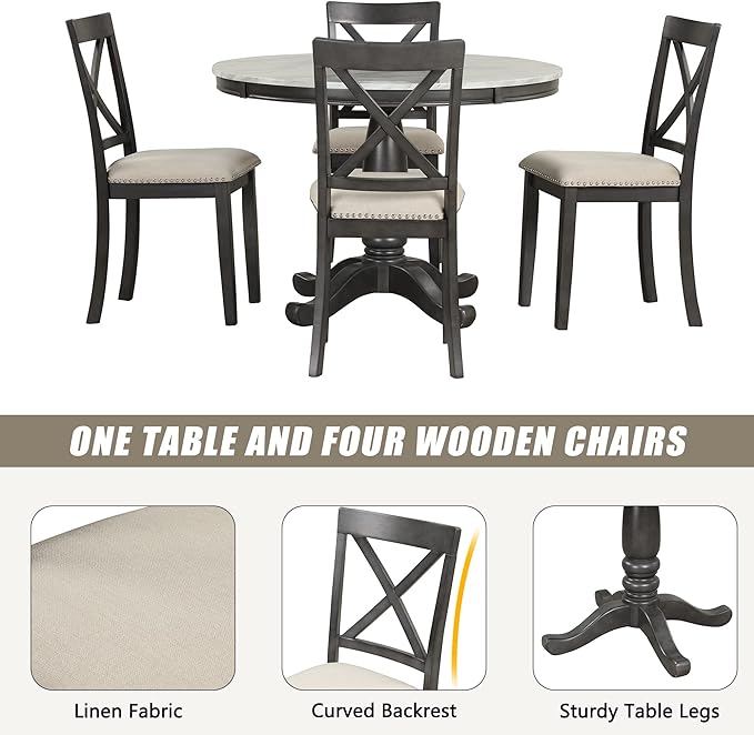5-Piece Top Round Dining Table Set for 4 Persons, Curved Backrest Linen Fabric Chairs, Modern Wood Kitchen Furniture, OneSize, Gray Marble