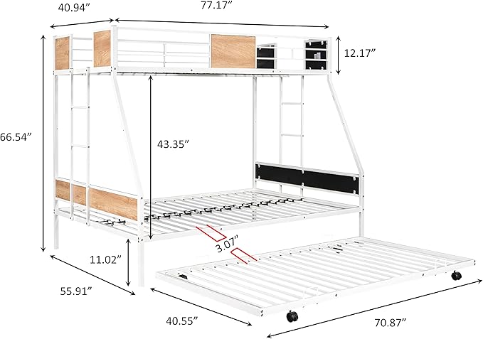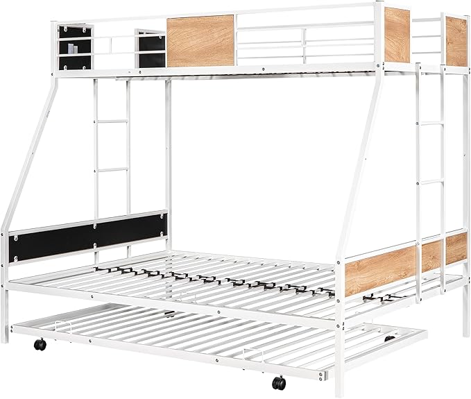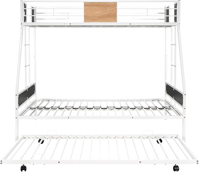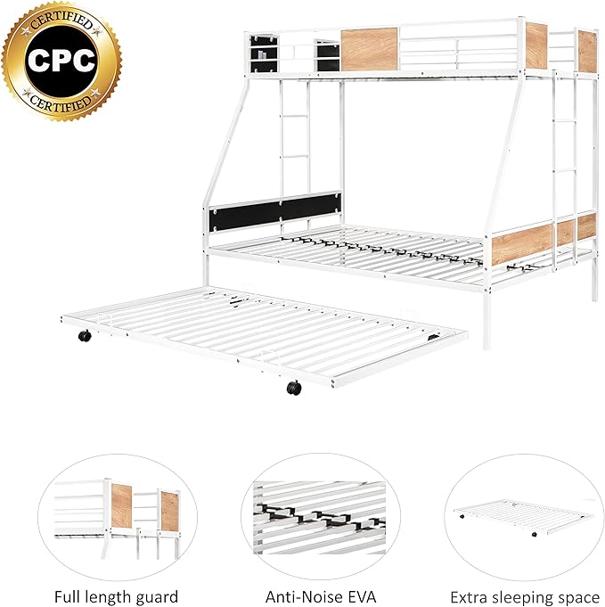 Twin over Full Bunk Bed with Trundle,Heavy-duty Sturdy Metal,Noise Reduced,Safety Guardrail,Wooden Decoration,Convenient-Trundle,Bunk-Bed for Three,CPC Certified,No Box Spring Needed,White