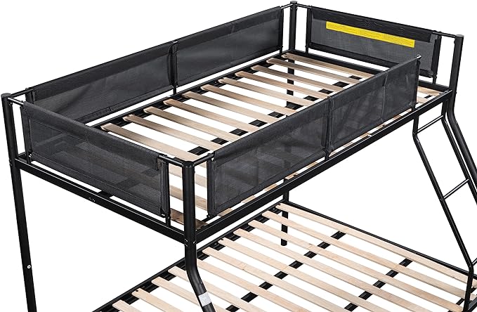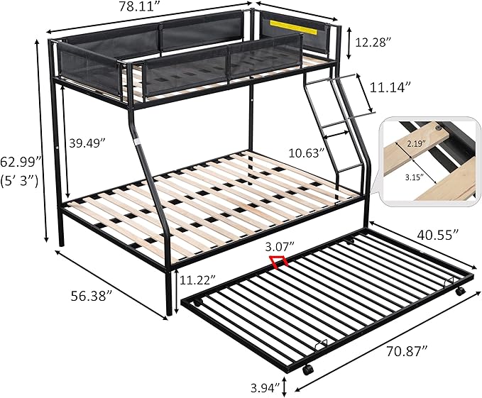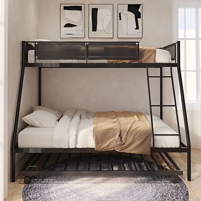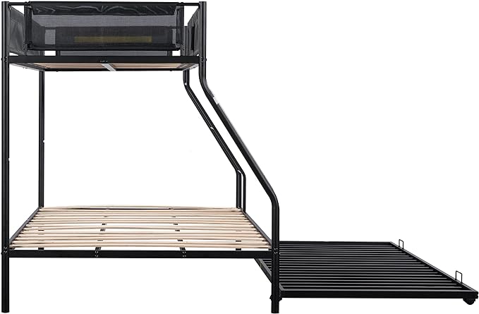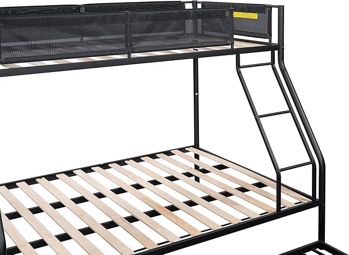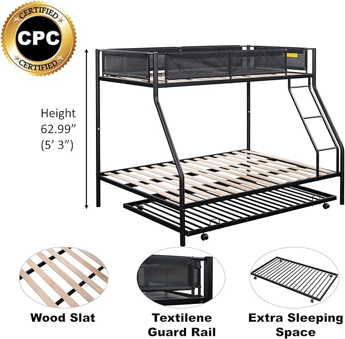 Twin over Full Metal Bunk Bed with Trundle,Sturdy-Metal Bed-Frame,Noise-Free Wood Slats,Comfortable Textilene Guardrail,Space-saving Trundle,Bunk-Bed for Three,No Box Spring Needed,Black