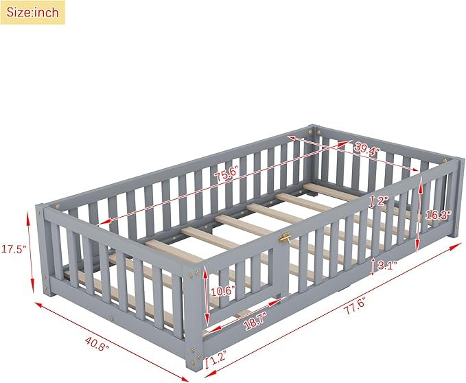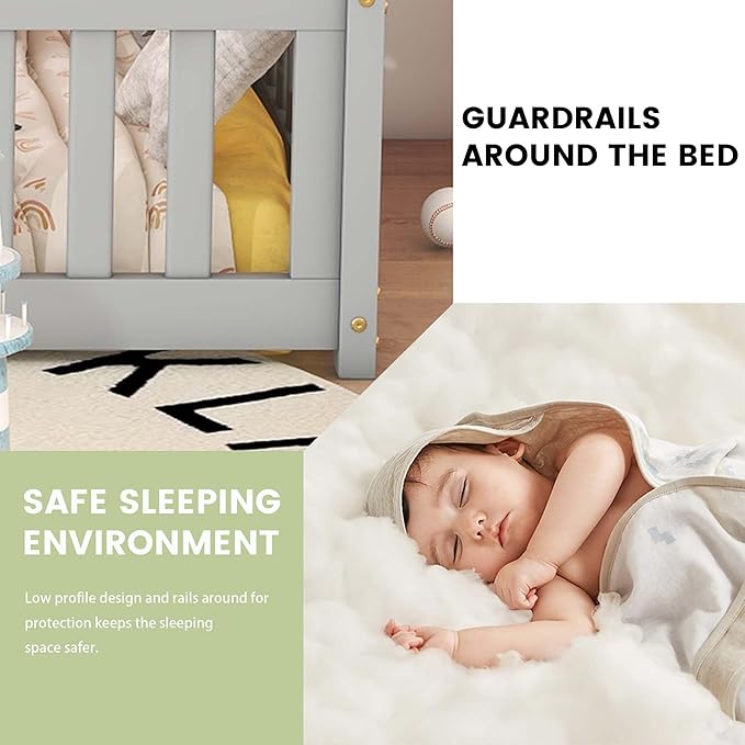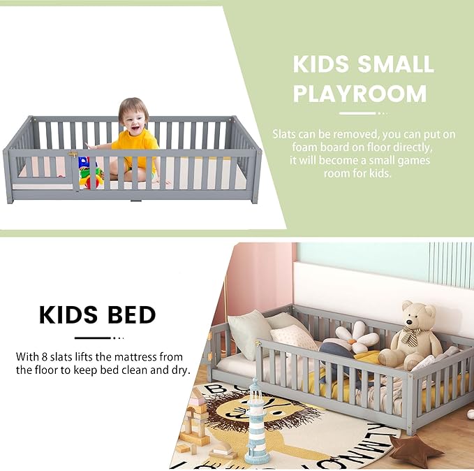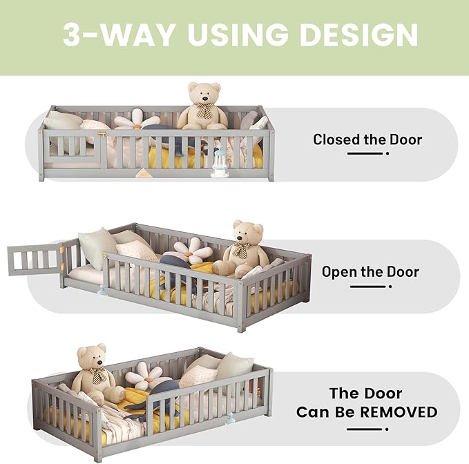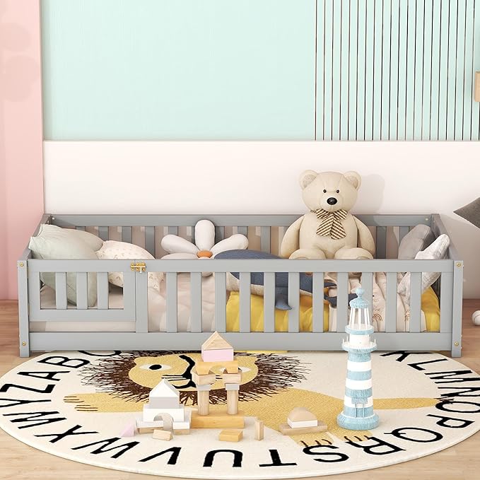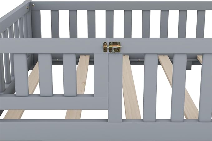 Multifunctional Twin Size Floor Bed with Safety Guardrails and Door, Removable Wood Slats, Montessori Beds Frame for Toddlers, for Boys and Girls, Gray