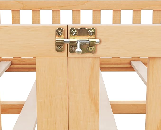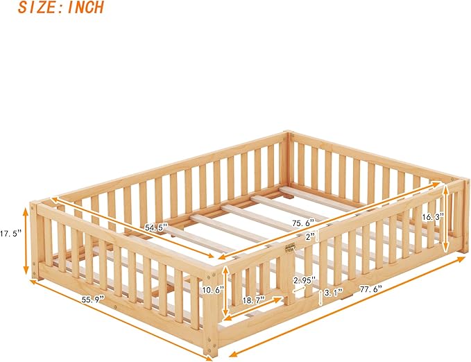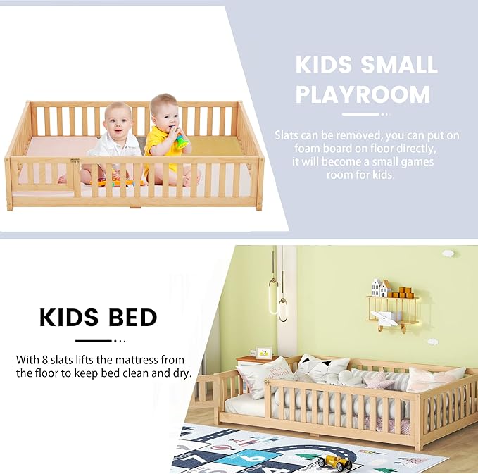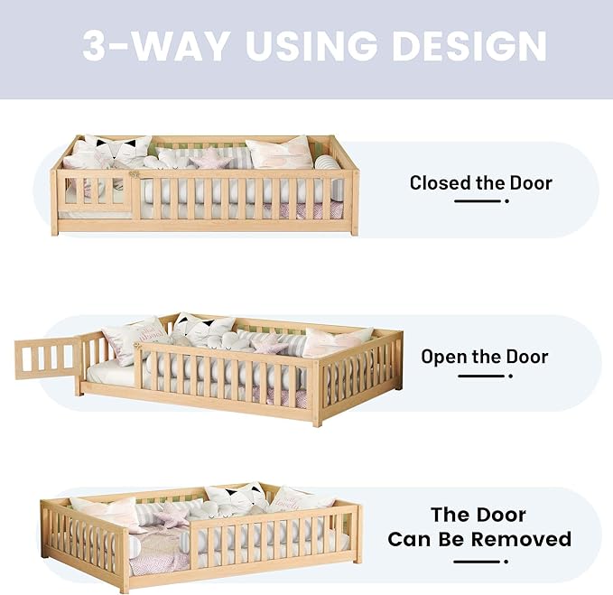 Multifunctional Full Size Floor Bed with Safety Guardrails and Door, Removable Wood Slats, Montessori Beds Frame for Toddlers, for Boys and Girls, Natural