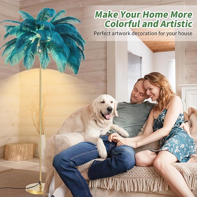 Feather Lamp, Natural Ostrich Feather Floor Lamp for Living Room, 63in Height, 3 Color Temperatures Bright LED Bulbs, Modern Funky Tall Lamp Standing Light for Bedroom (Blue)