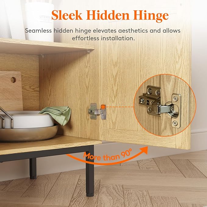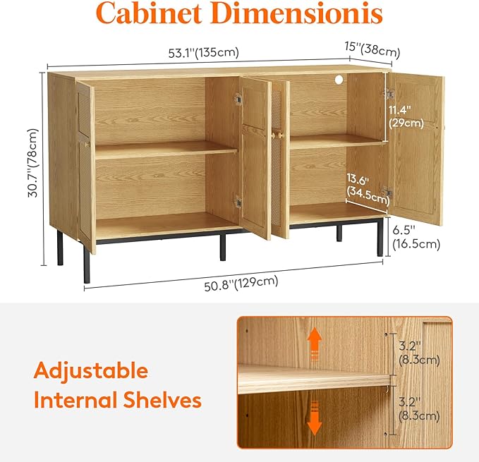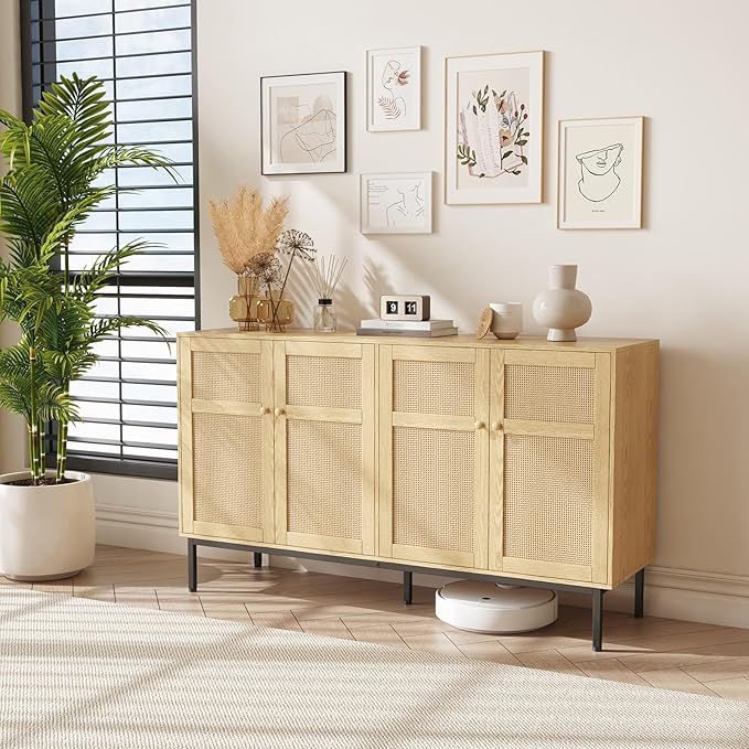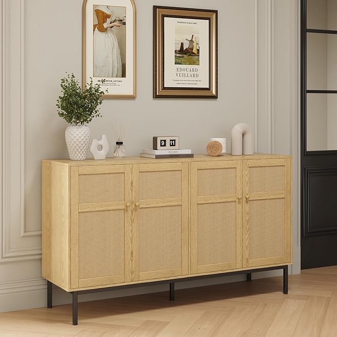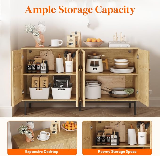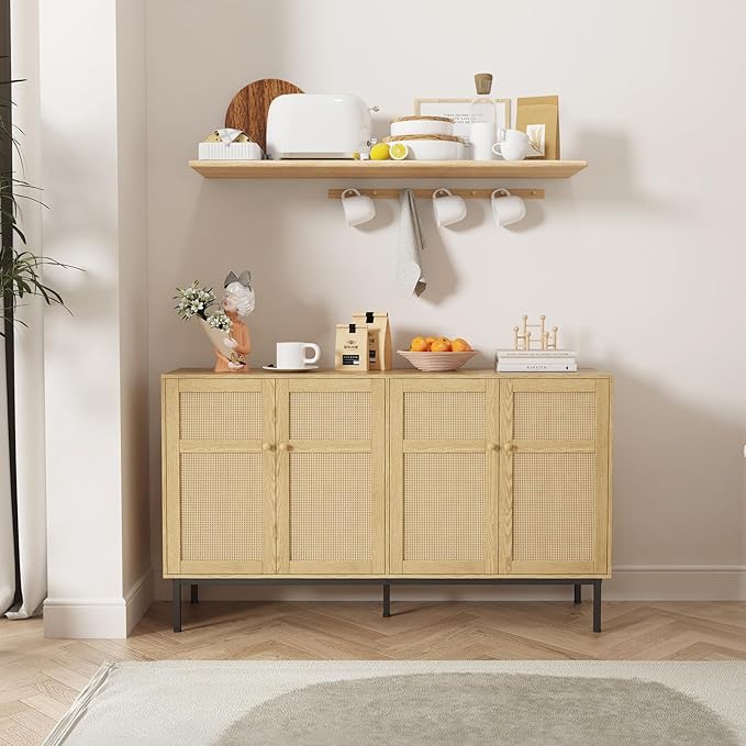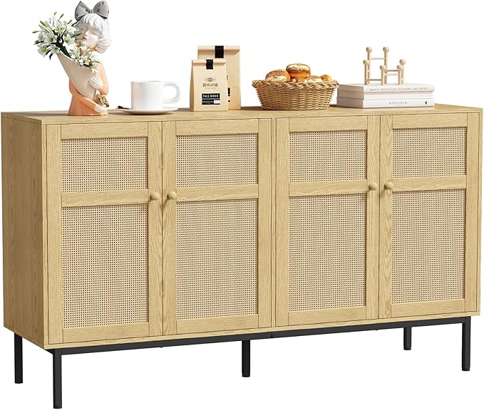 Lifewit Rattan Sideboard Buffet Cabinet, Console Table, Credenza, Storage Cabinet, Coffee Bar Cabinet for Kitchen, Dining Room, Living Room, Entryway, 4 Doors, Natural