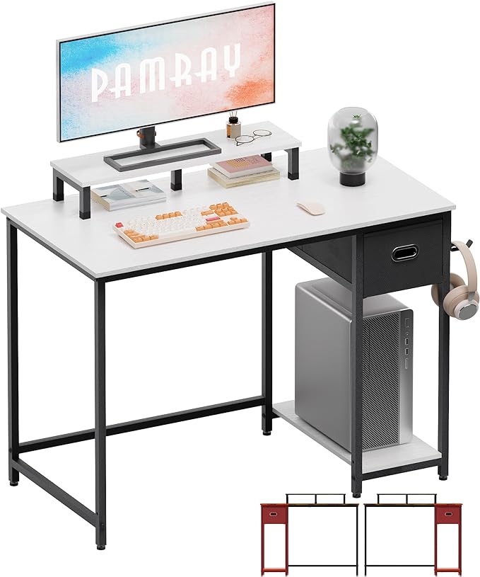 Pamray 39 Inch Computer Desk with Monitor Stand Small Home Office Desks with Non-woven Storage Drawer for Bedroom Study Table Writing and Work Desk White