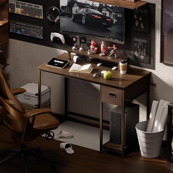 Pamray 39 Inch Computer Desk with Monitor Stand Small Home Office Desks with Non-woven Storage Drawer for Bedroom Study Table Writing and Work Desk Deep Brown