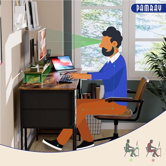 Pamray 55 Inch Computer Desk with Non-woven Storage Drawers and Monitor Stand Home Office Desk for Bedroom Study Table Writing and Work Desk Black