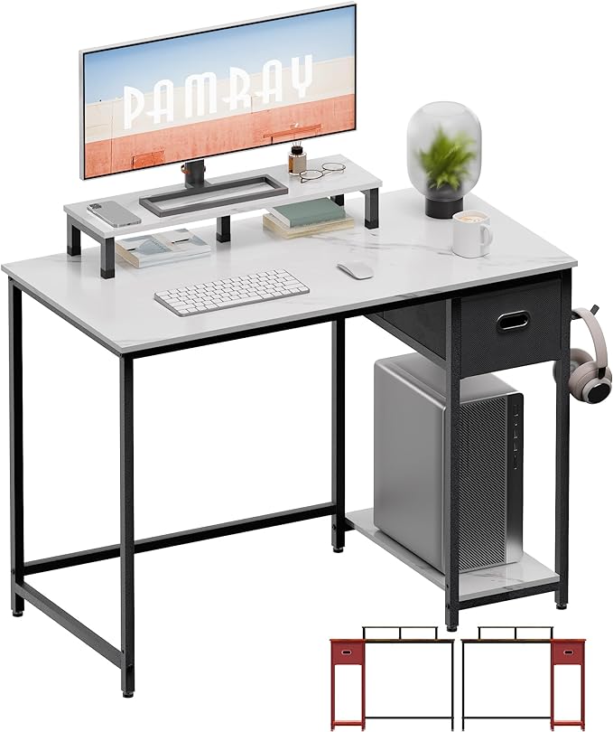 Pamray 39 Inch Computer Desk with Monitor Stand Small Home Office Desks with Non-woven Storage Drawer for Bedroom Study Table Writing and Work Desk White Marble
