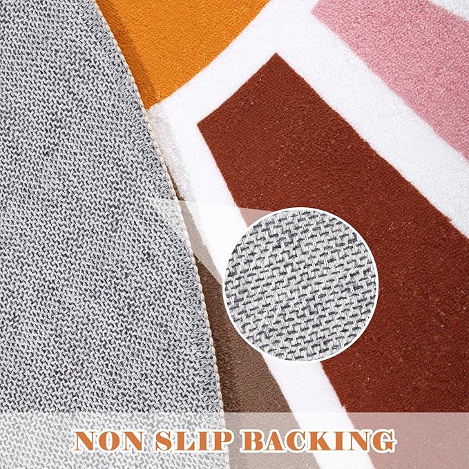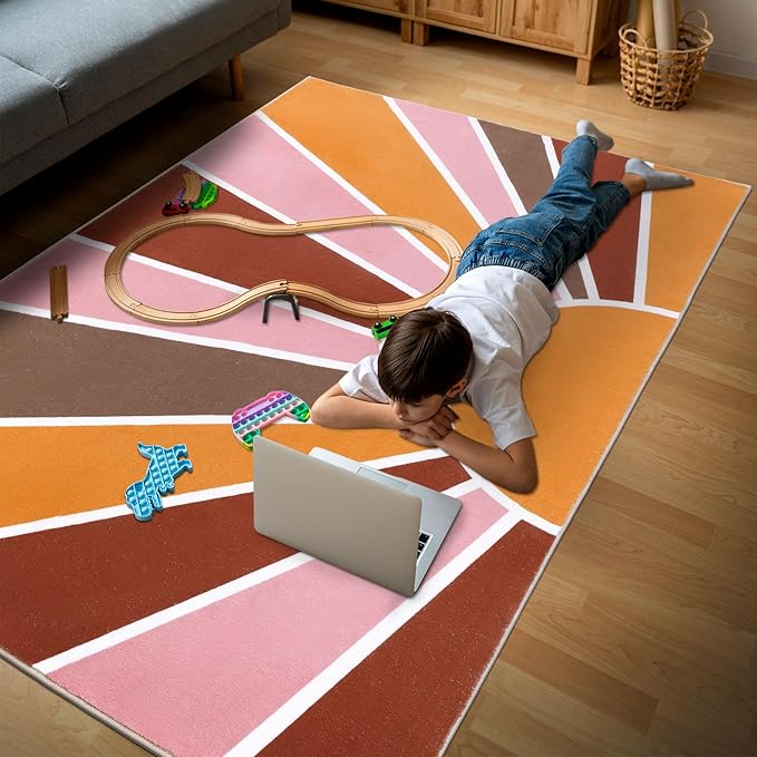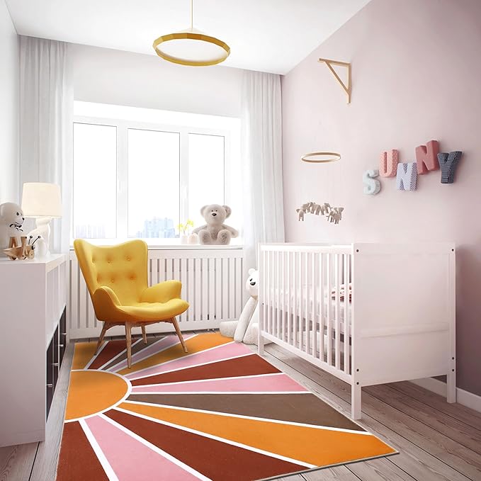 Topotdor Sun Rainbow Area Rug 4 x 6ft Boho Kids Nursery Rug, Colorful Washable Area Rug Ultra Soft Circle Classroom Rug Non-Slip for Bedroom Living Room Playroom Decor, Pink