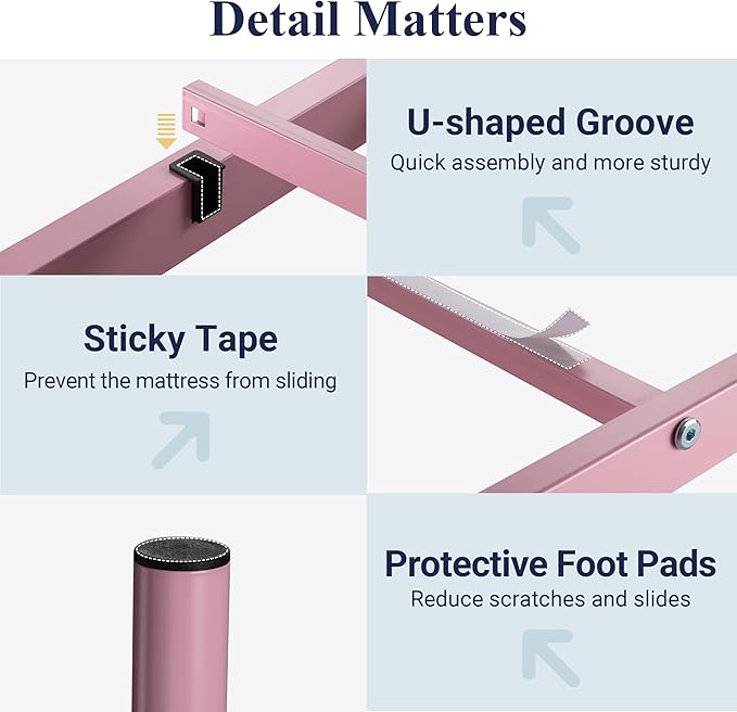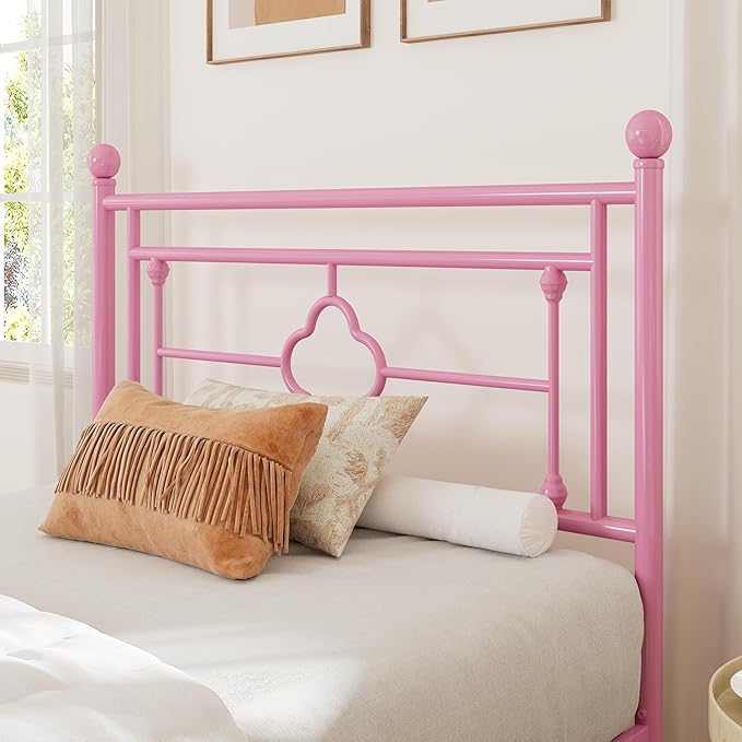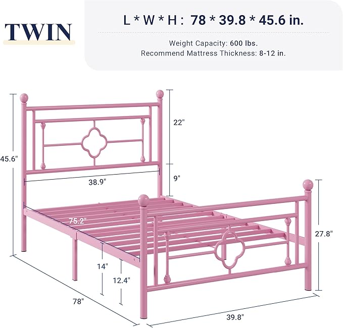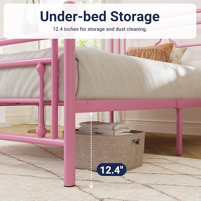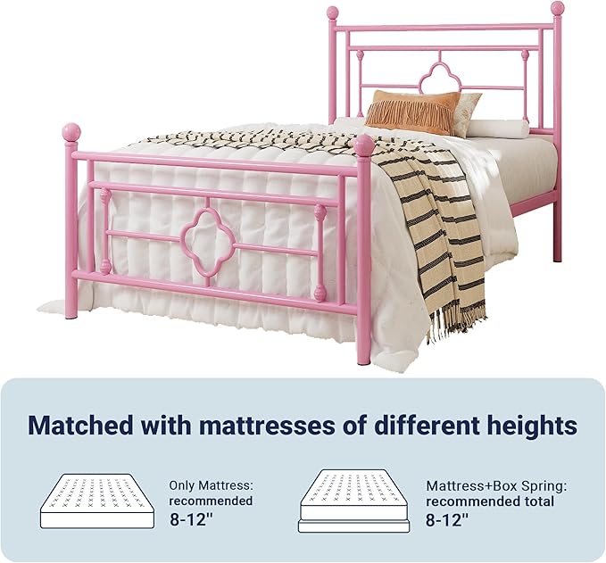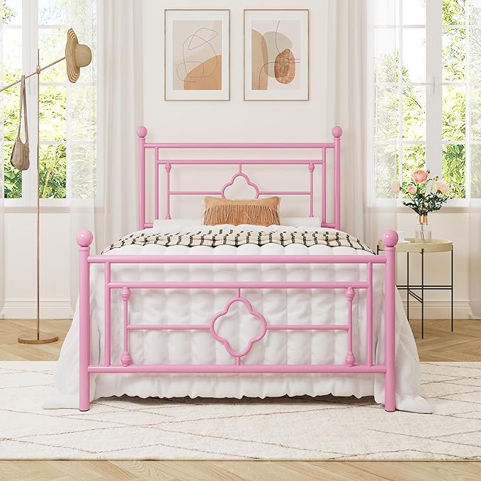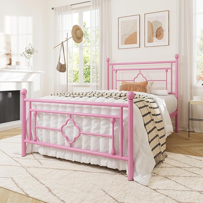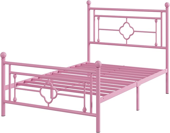 Allewie Twin Size Metal Platform Bed Frame with Victorian Vintage Headboard and Footboard/Mattress Foundation/Under Bed Storage/No Box Spring Needed/Noise-Free/Easy Assembly, Pink