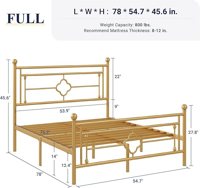 Allewie Full Size Metal Platform Bed Frame with Victorian Vintage Headboard and Footboard/Mattress Foundation/Under Bed Storage/No Box Spring Needed/Noise-Free/Easy Assembly, Gold