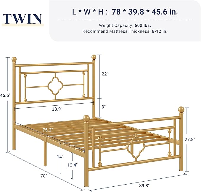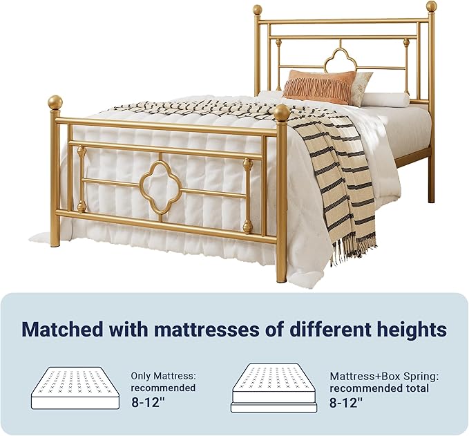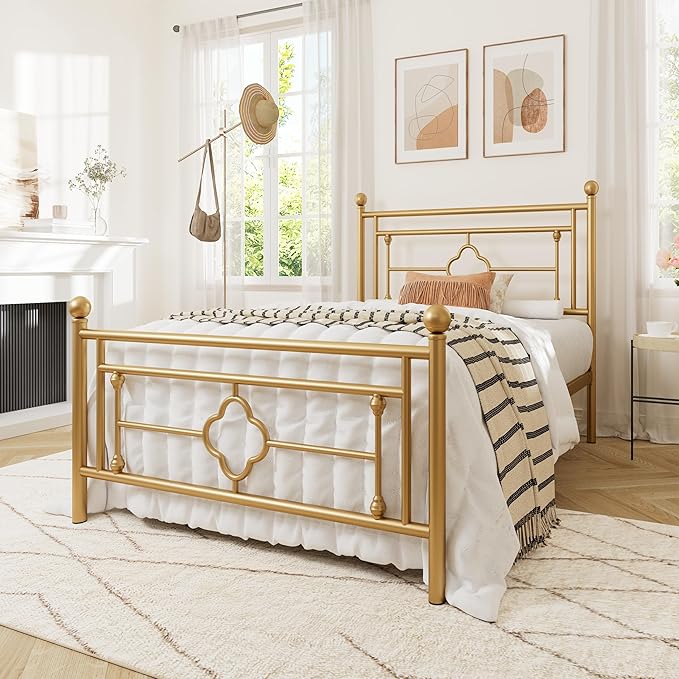 Allewie Twin Size Metal Platform Bed Frame with Victorian Vintage Headboard and Footboard/Mattress Foundation/Under Bed Storage/No Box Spring Needed/Noise-Free/Easy Assembly, Gold