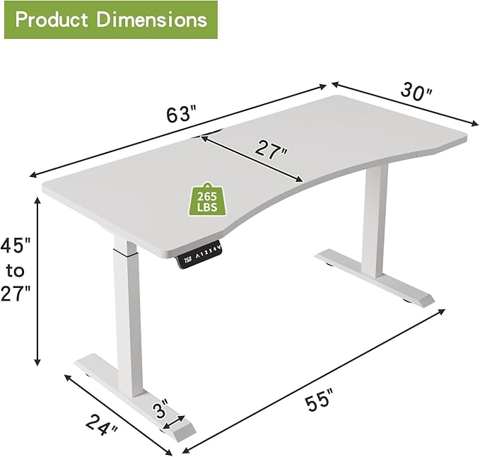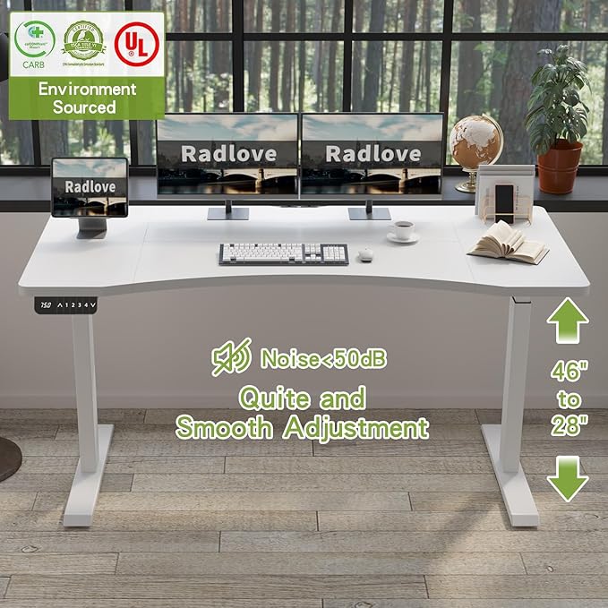 Radlove Dual Motors Height Adjustable 63 x 30'' Electric Standing Desk with Curved Design Stand Up Table 4 Memory Keys, Computer Desk with Splice Board Home Office Desk, WhiteTop + White Frame