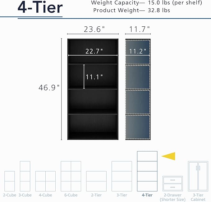 Apexa 4-Tier Cube Storage Organizer Shelves, Stackable Wood Bookcase Fits Cubby Bins for Organization, Dorm Teen Room Decor & Home Office, Black