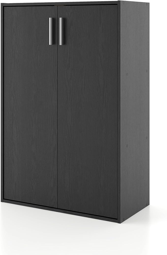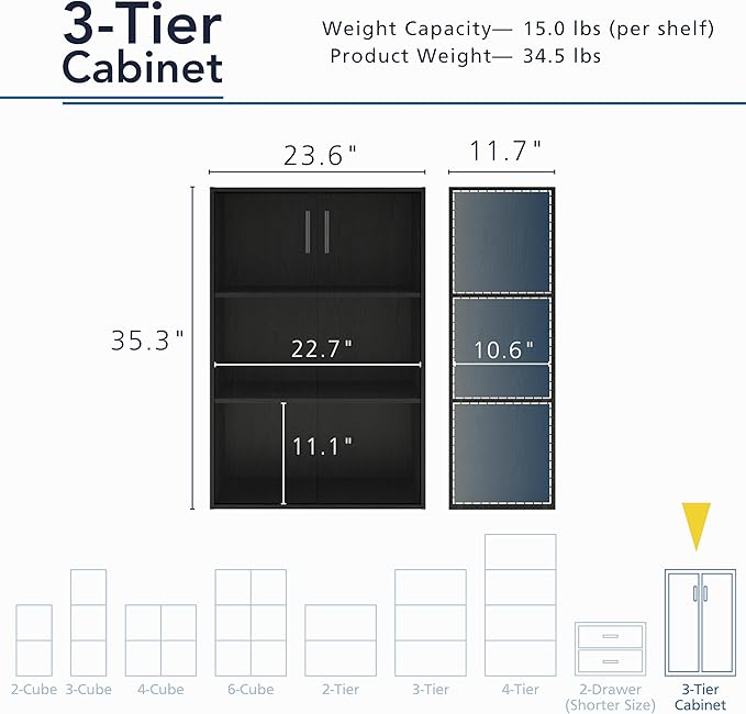 Apexa Stackable Wood Bookcase with Doors, Cube Storage Organizer Shelves, Small Food Pantry, Dorm Teen Room Decor & Bedroom, Home Office, Kitchen, 3-Tier Cabinet, Black