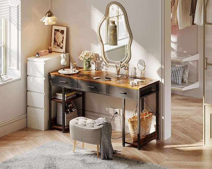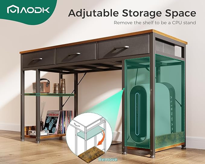 AODK 55 Inch Office Desk with Fabric Drawers & Power Outlets, Computer Desk with Storage Shelves & CPU Stand, Study Table, Writing Desk for Bedroom, Vintage