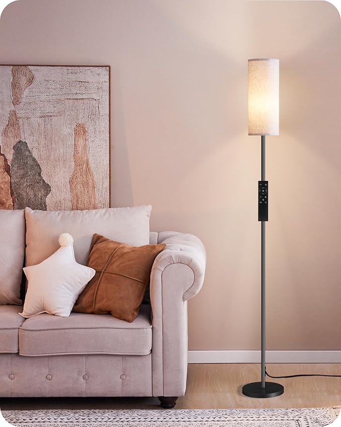 Dimmable Floor Lamp for Living Room, Corner Floor Lamp with Remote, 66'' Standing Tall Lamp, Linen Lampshade, 10W 800LM LED Bulb for Bedroom Study, FCC Listed Black and White W06LD05