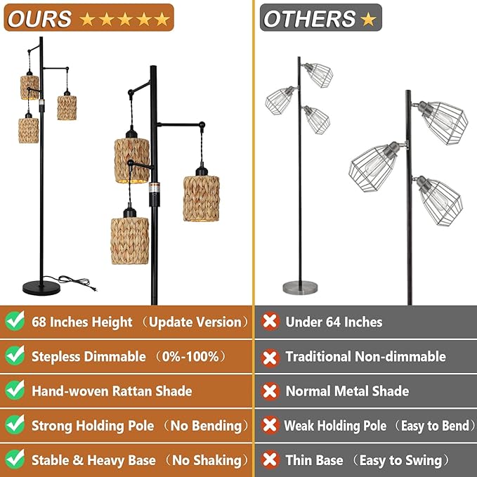Rattan Floor Lamp, 3-Lights Boho Floor Lamp with Stepless Dimmer, Farmhouse Rustic Floor Lamps for Living Room, Tall Floor Lamp with Rattan Shades, Dimmable Standing Lamp for Bedroom