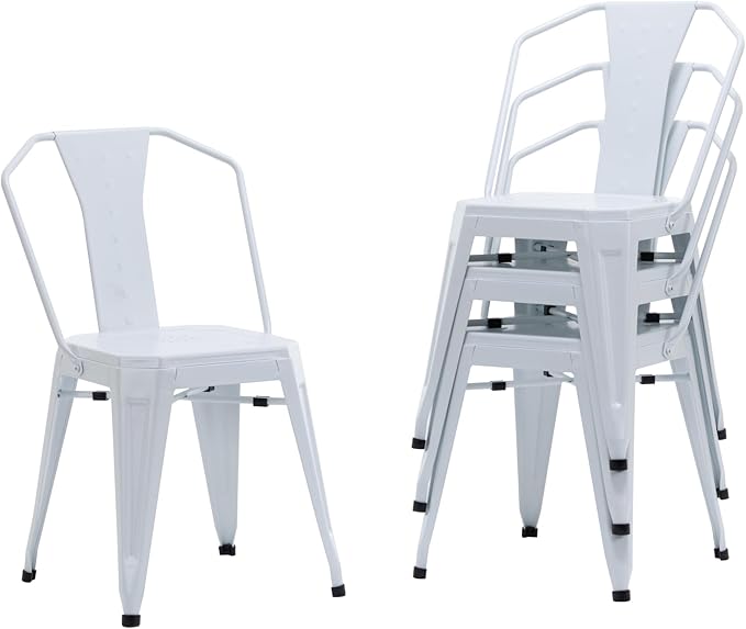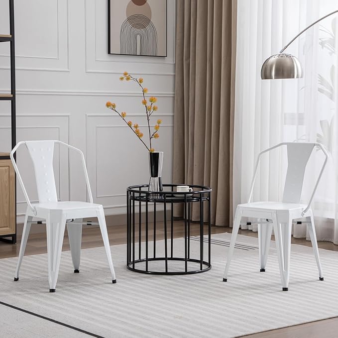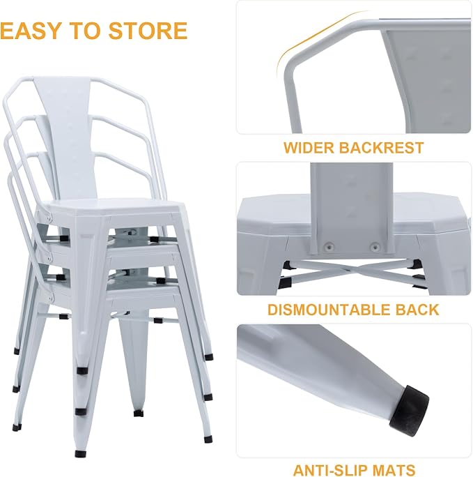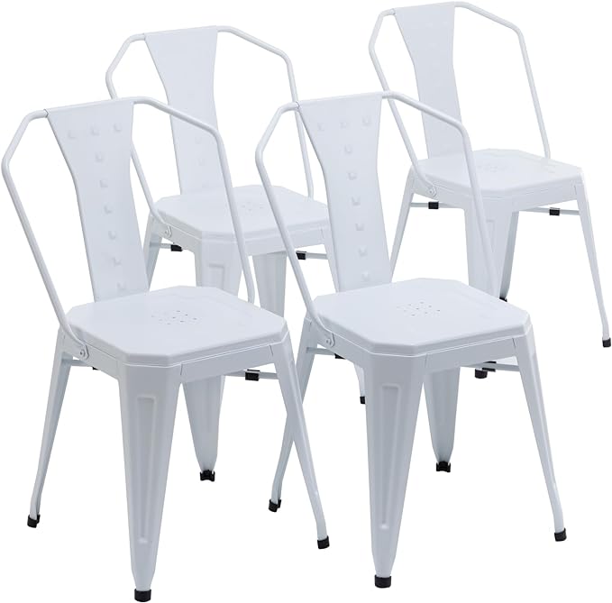 Modern Dining Chair Set of 4, Stackable Metal Chairs, Waterproof Counter Bar Chairs with High Backrest, Quick Assembly Cafe Chairs, Tolix Style for Home, Kitchen and Bar Use, White