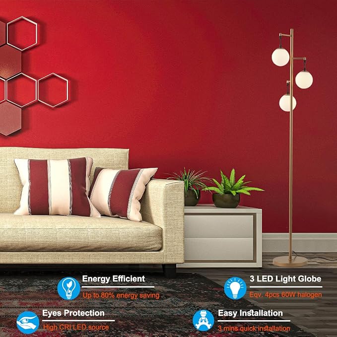 Modern Gold Globe Floor Lamp with 3 Frosted Orb Glass Shade and 3000K LED Bulbs, Mid Century Standing Lamp, Farmhouse Retro Tall Lamp for Living Room Bedroom