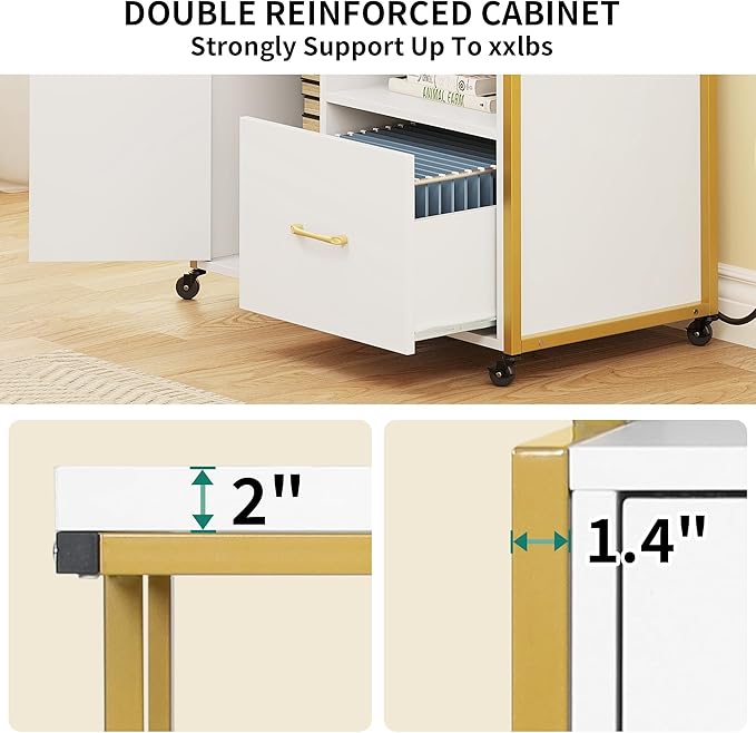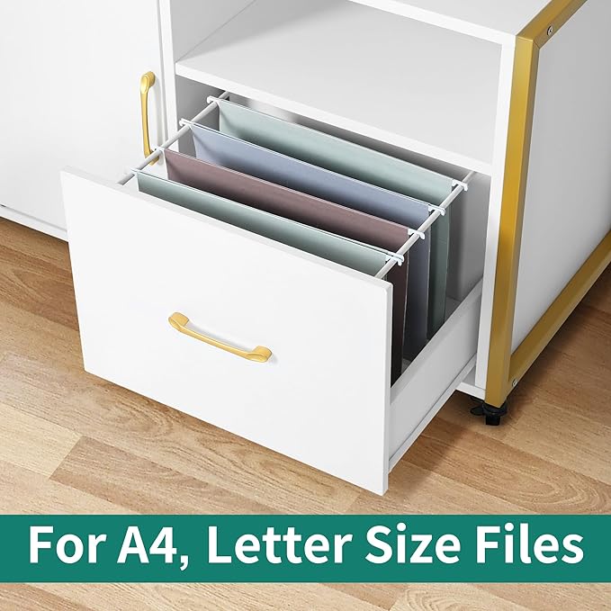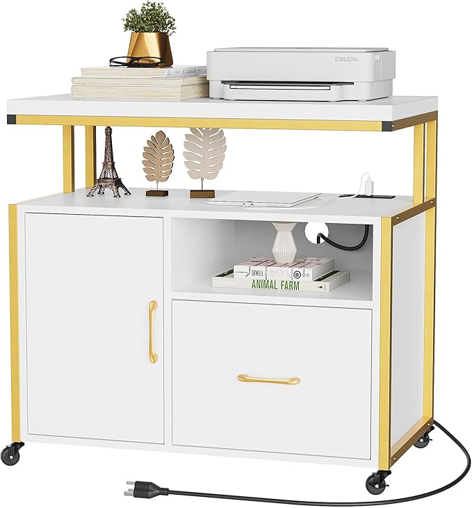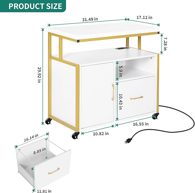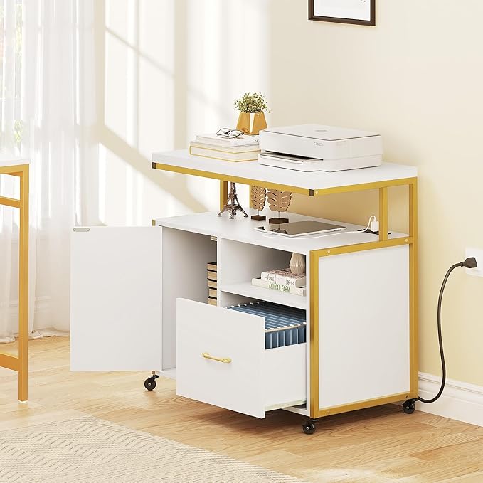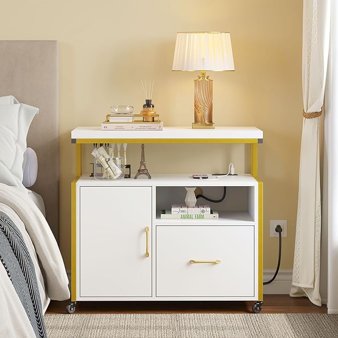 YITAHOME Wood File Cabinet with Charging Station, Rolling Filing Cabinet Cart with Door, Industrial Nightstand with Printer Shelf for Home Office, Bedroom, Living Room, Entryway, Gold and White