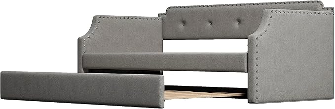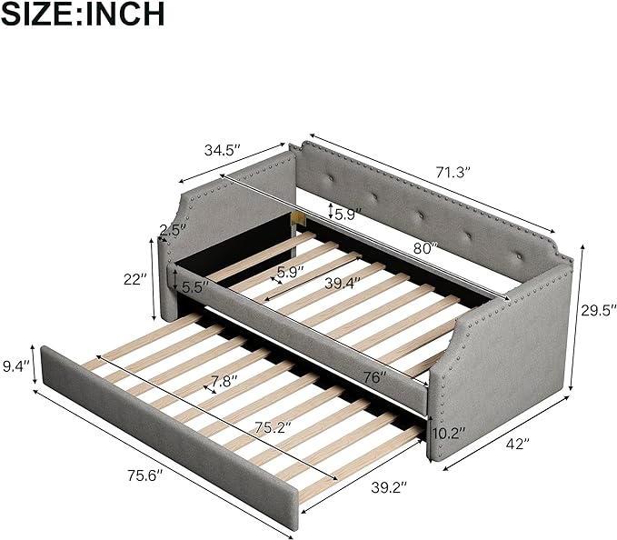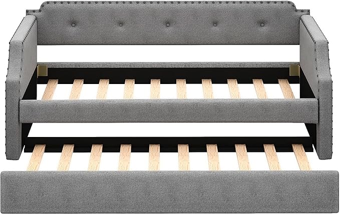 Twin Size Upholstered Daybed with Trundle, Sofa Bed Wood DayBed Frame, No Box Spring Needed, Gray