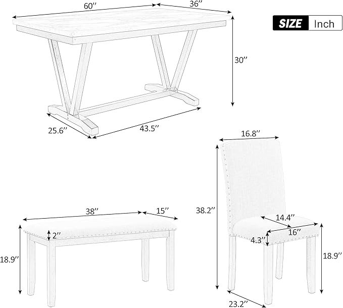 Modern Elegant Style Dining Set for 6 Table and 4 Upholstered Chairs and Bench for Family Kitchen Dinette Room, White, 60" L x 36" W x 30.3" H, Marbled Veneer Tabletop