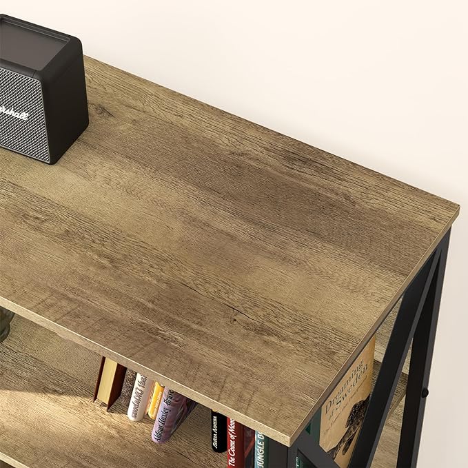 About This [6-Cube Storage Organizer Wide Bookshelf] Low horizontal bookcase combination of rustic oak board and black metal frame flawlessly...