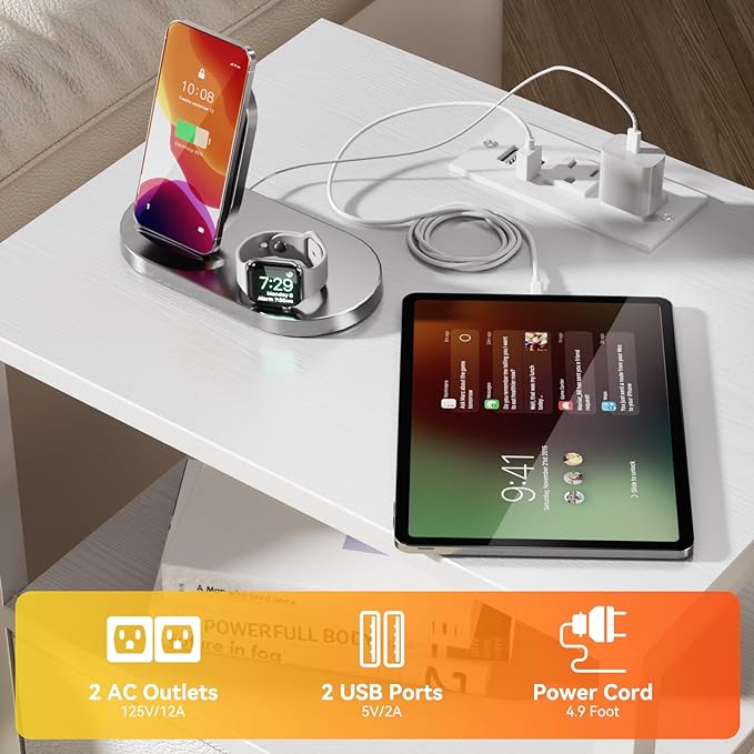 Furologee Nightstand with Charging Station, White Night Stand with LED Lights, 3-Tier Storage End Table with Fabric Drawers, Side Table with USB Ports & Outlets for Lving Room/Bedroom