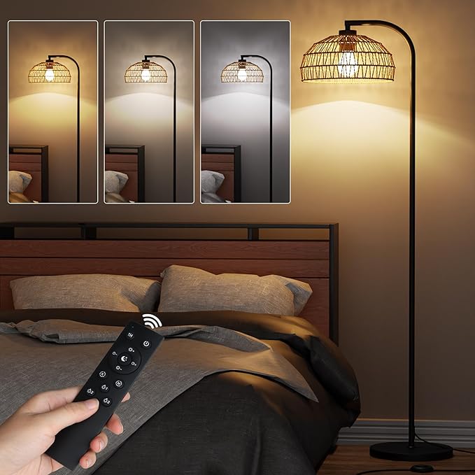 Boho Floor Lamp for Living Room,Rattan Floor Lamps with Remote,3 Color Temperature and Stepless Dimmable,Farmhouse Standing Lamps for Bedroom,Office with Handmade Lampshade,12W Smart Bulb Included