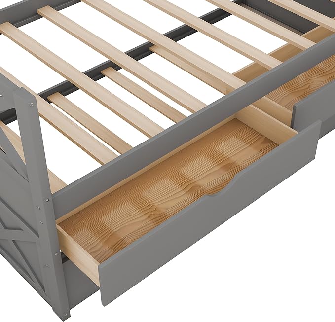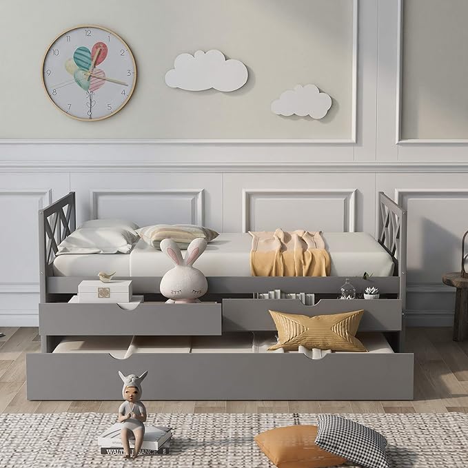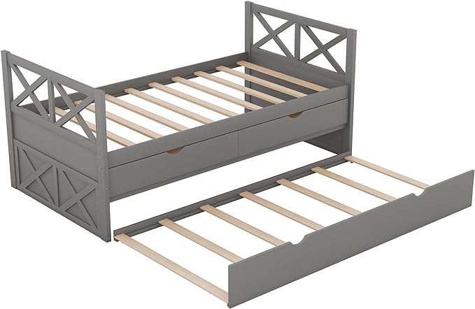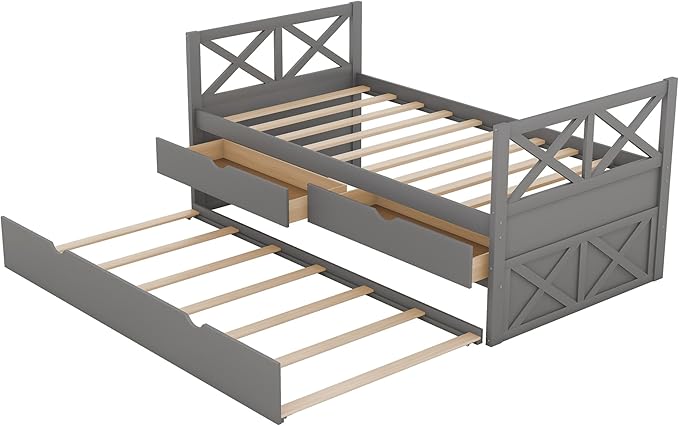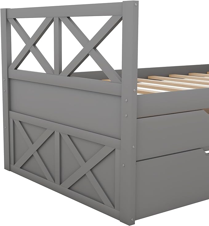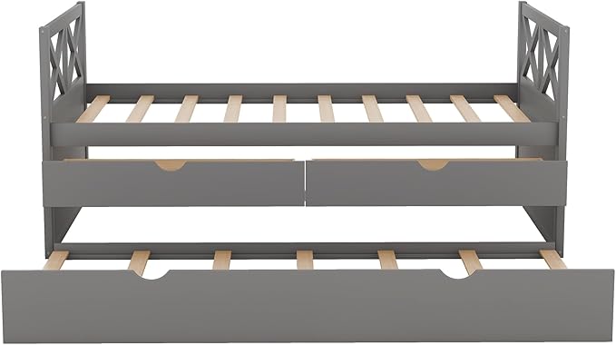 Twin Size Daybed with 2 Storage Drawers and Trundle, Solid Wood Captains Bed Frame for Bedroom and Living Room, Gray