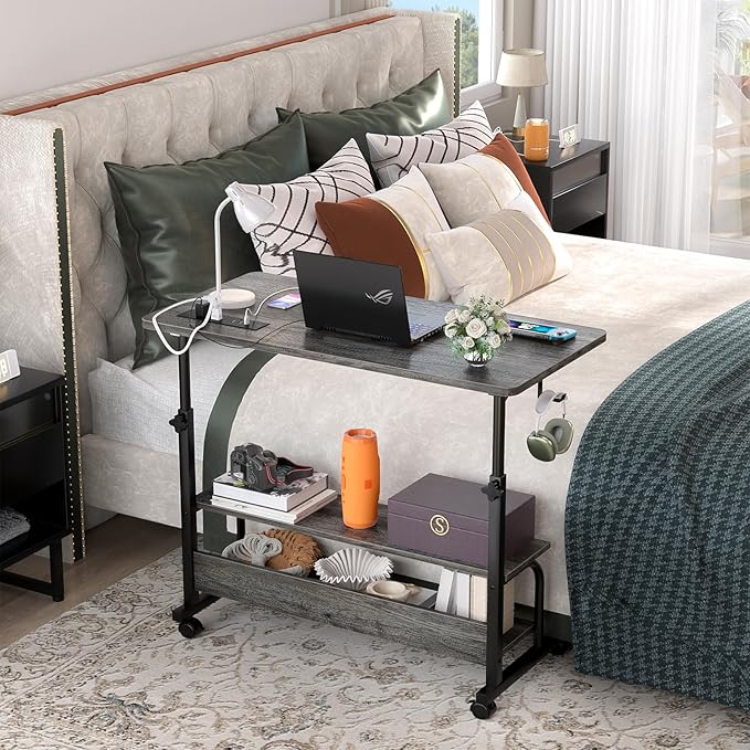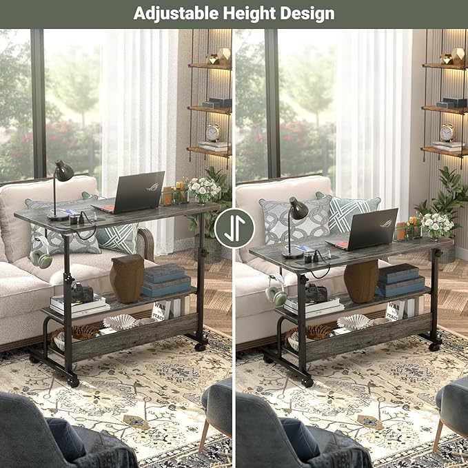 32" Height Adjustable Standing Desk with Power Outlets - Manual Rolling Stand Up Desk with Wheels Small Portable Computer Desk Mobile Laptop Table with Storage Shelves for Home Office, Grey Oak