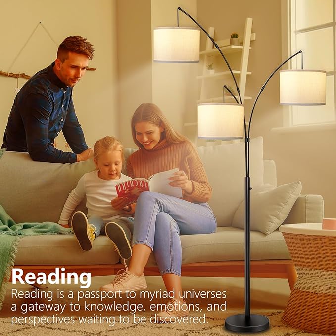 Arc Floor Lamps for Living Room,Modern Mid Century Tall Standing Floor Lamp with Heavy Base for Bedroom Office,3-Light Floor Lamp with Adjustable Hanging and 3 LED Bulbs (Black+White Shade)