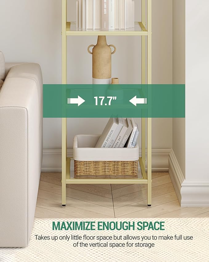 Bookcase Bookshelf, Tempered Glass Arched Bookshelf for More Storage, Slim Shelving Unit for Bedroom, Bathroom, Home Office, Steel Frame, 6 Tier Gold BC20699G