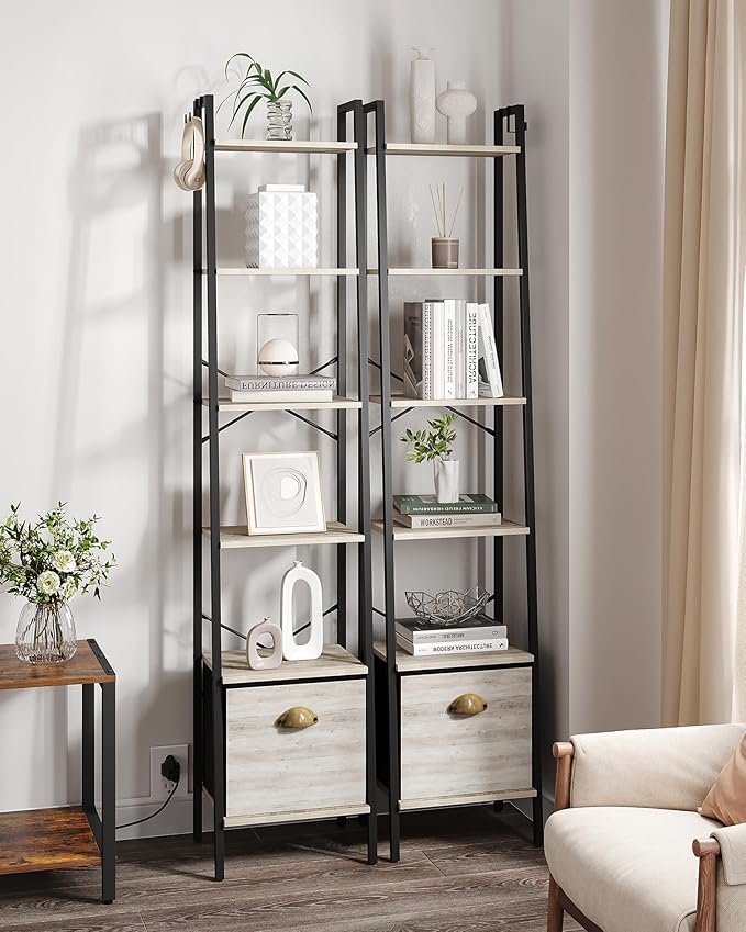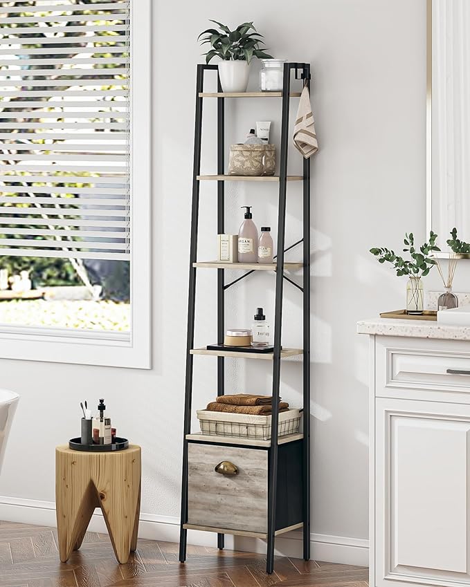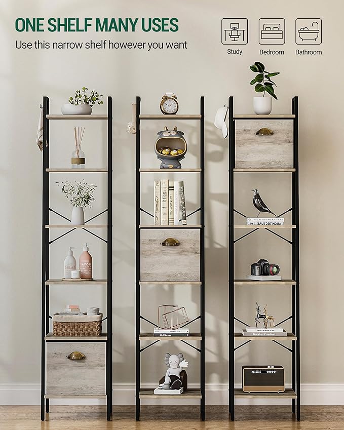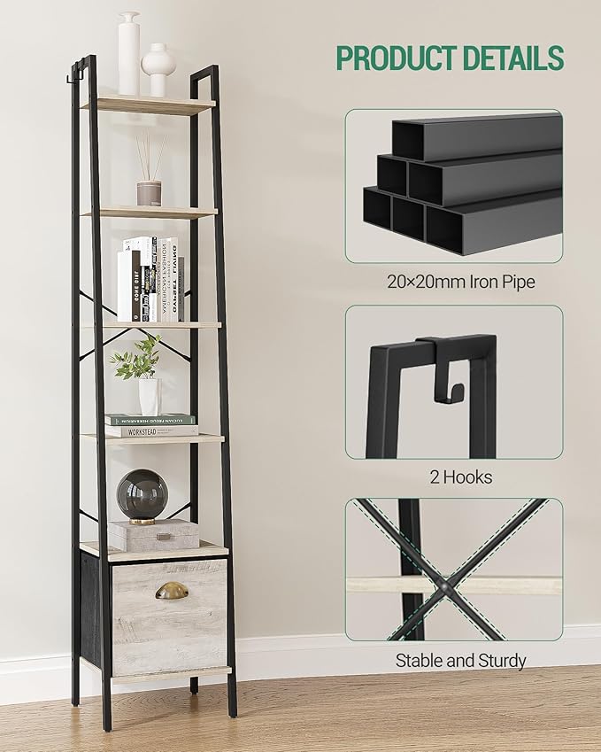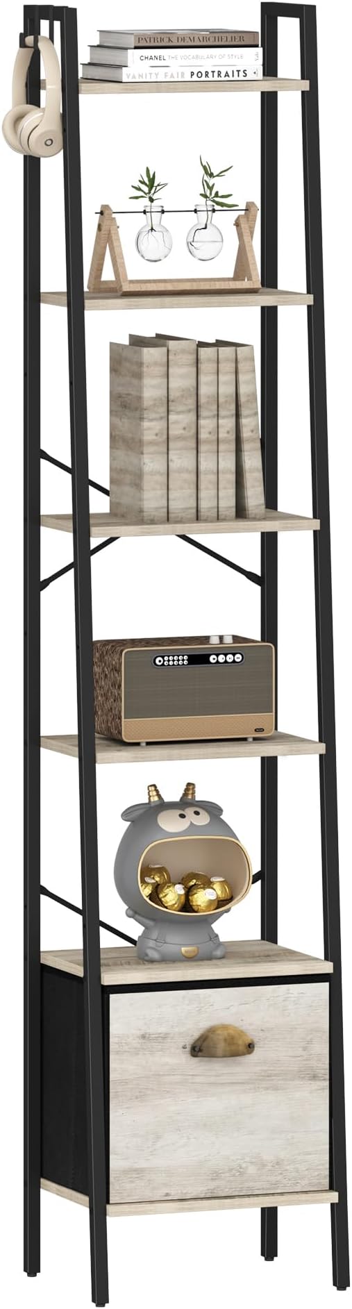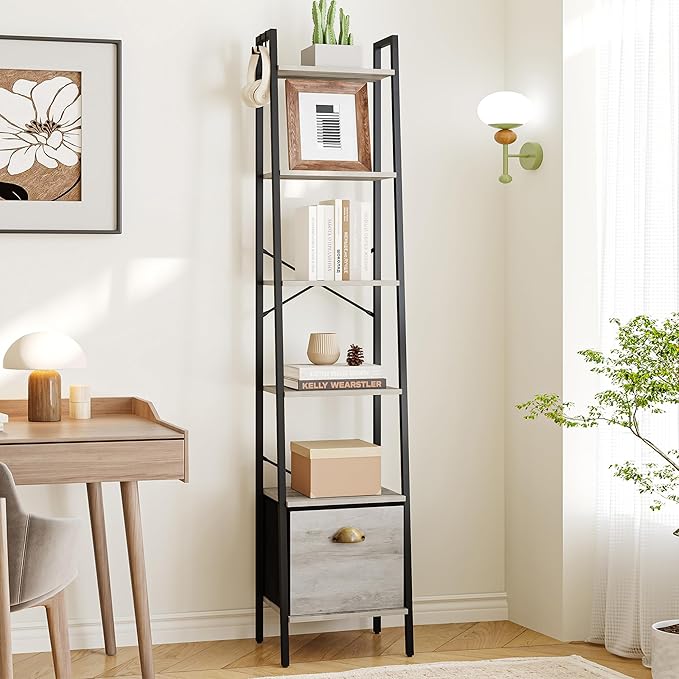 Narrow Bookshelf Bookcase with Drawer, Ladder Shelf with 2 Hooks, Bookshelves Storage Organizer, Freestanding Display Standing for Home Office, Bedroom, 6 Tier Greige BC19605B