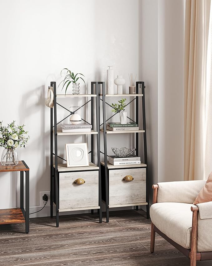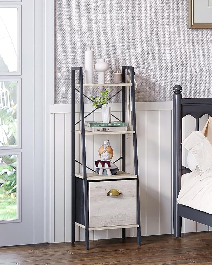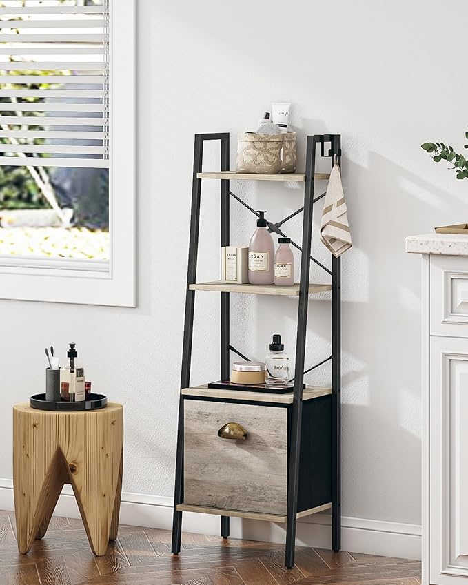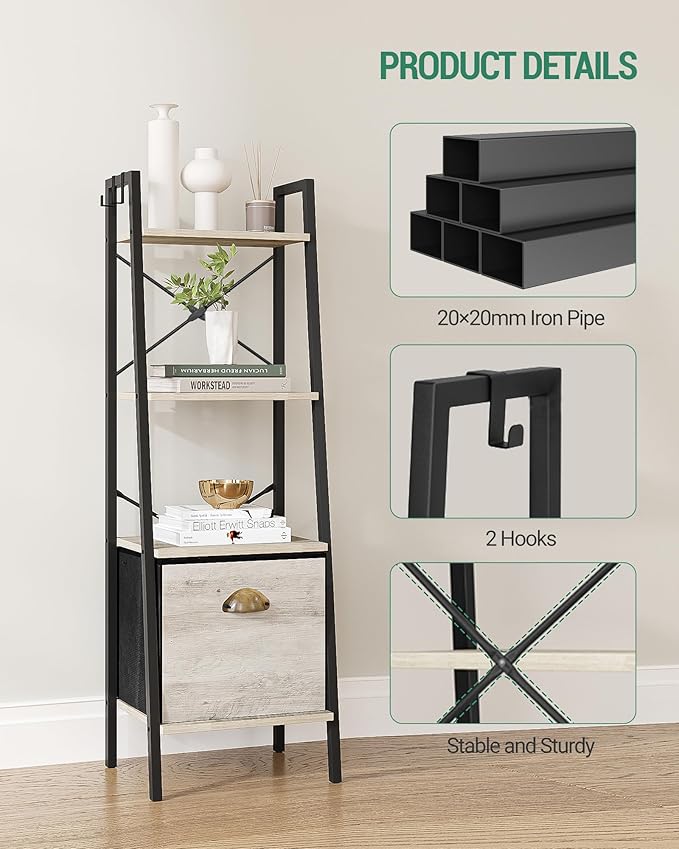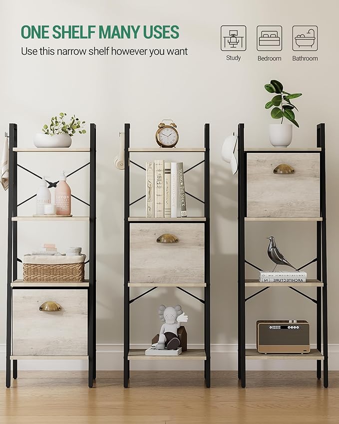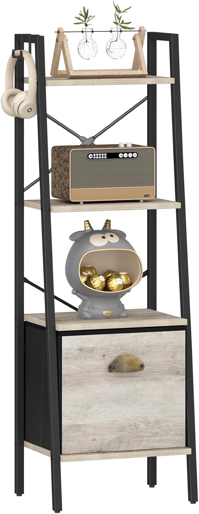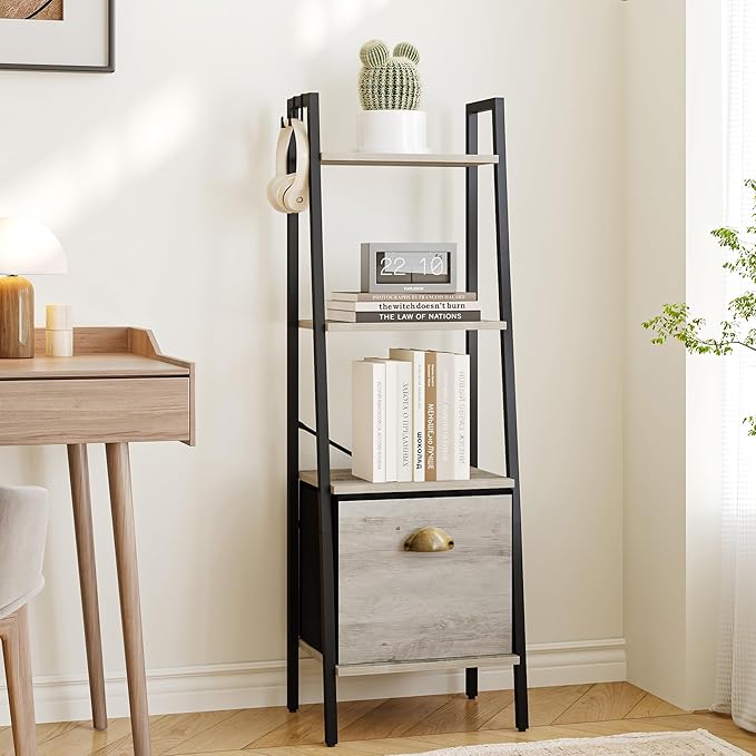Narrow Bookshelf Bookcase with Drawer, Ladder Shelf with 2 Hooks, Bookshelves Storage Organizer, Freestanding Display Standing for Home Office, Bedroom, 4 Tier Greige BC19405B