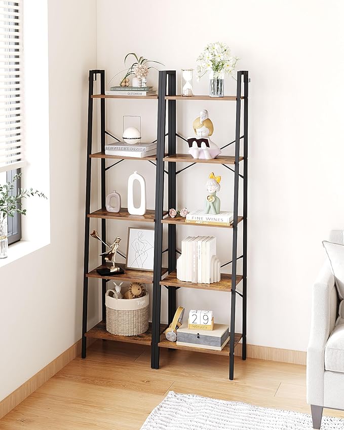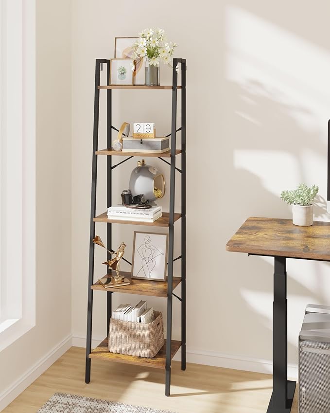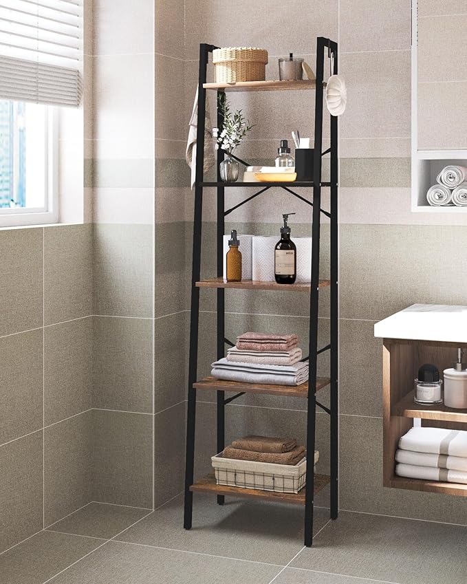 Ladder Shelf, Bookshelf Bookcase, Freestanding Corner Storage Shelve with 2 Hooks for Home Office, Living Room, Kitchen, Bedroom, Industrial, 5-Tier Rustic Brown BC19201B