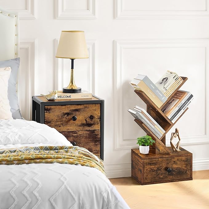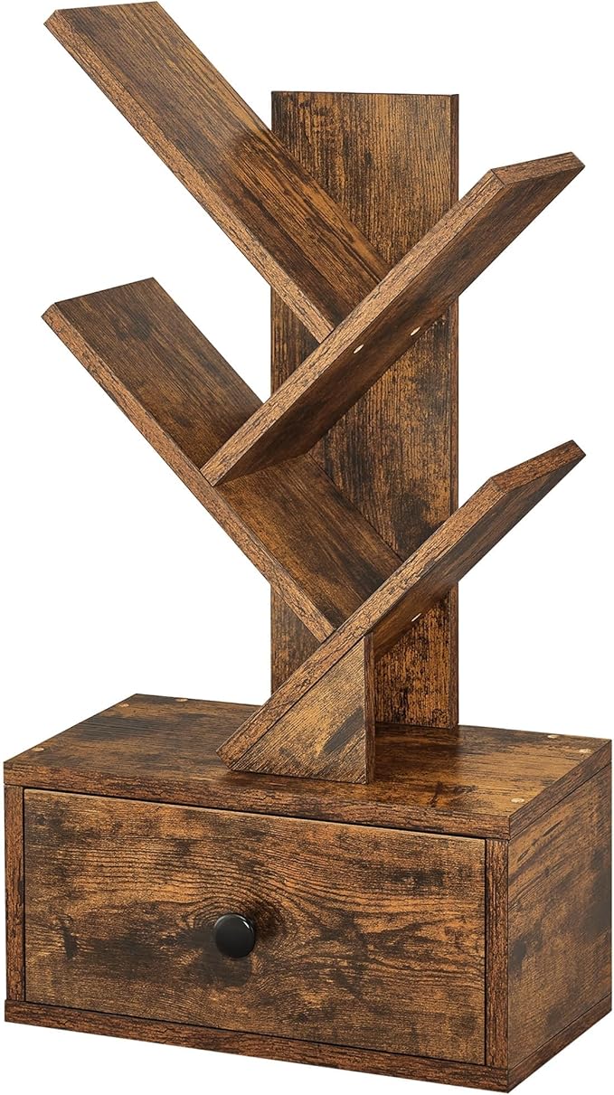 4 Tier Tree Bookshelf with Drawer, Small Tree Bookcase, Table Top Book Shelf Organizer Shelves for Living Room, Bedroom, Home Office, Rustic Brown