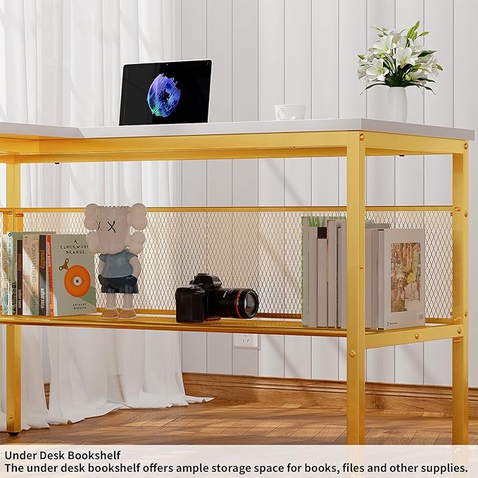 L Shaped Desk, 55 Inch Reversible Computer Desk with Power Outlet and RGB LED Light, Sturdy Corner Office Gaming Desk with Ergonomic Monitor Stand, Attractive Grid Design, White and Gold